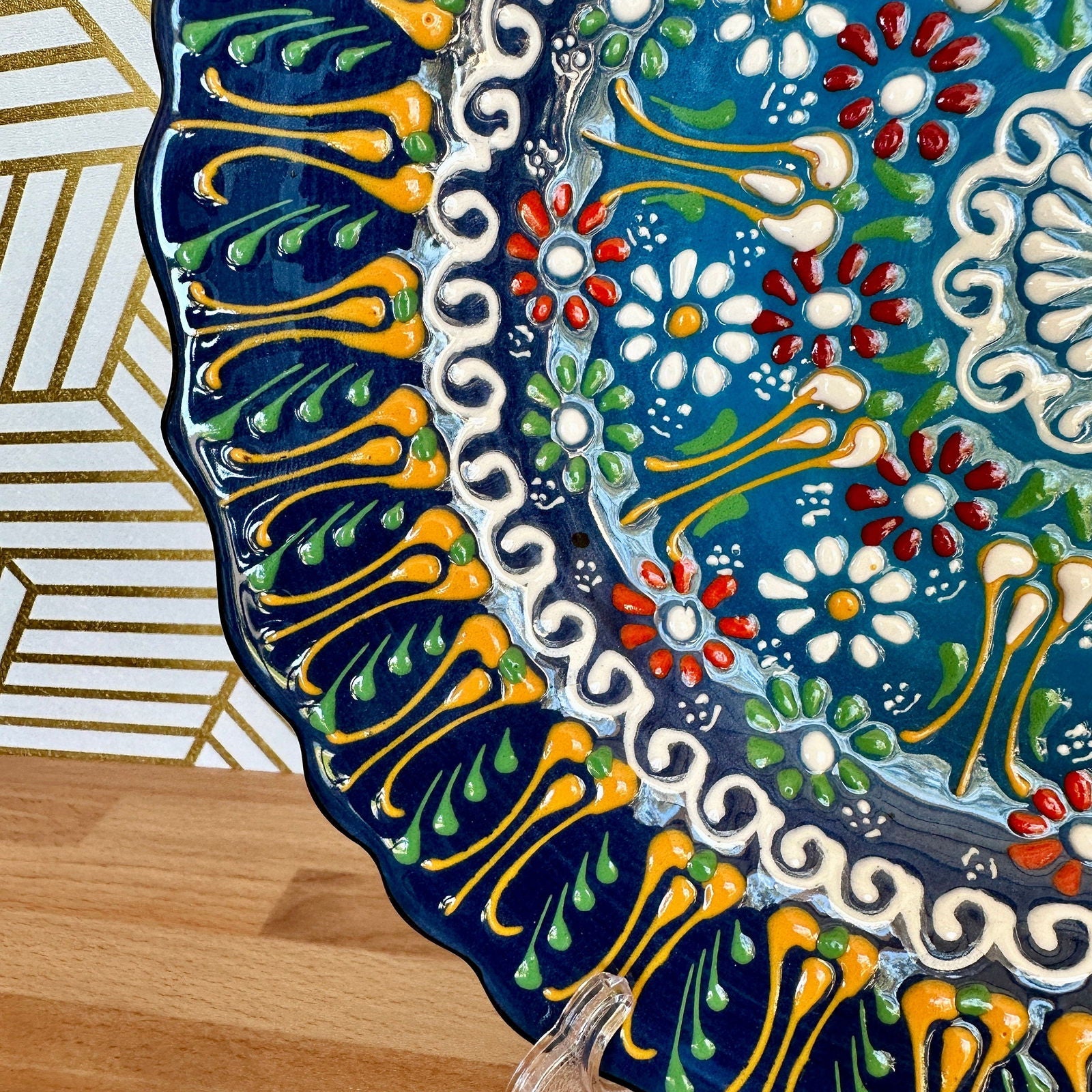 10” Turkish Ceramic Handmade & Painted Plate - Blue, Green, Yellow Dot Art Floral Tulip Patterned - Wall Hanging or Stand Use