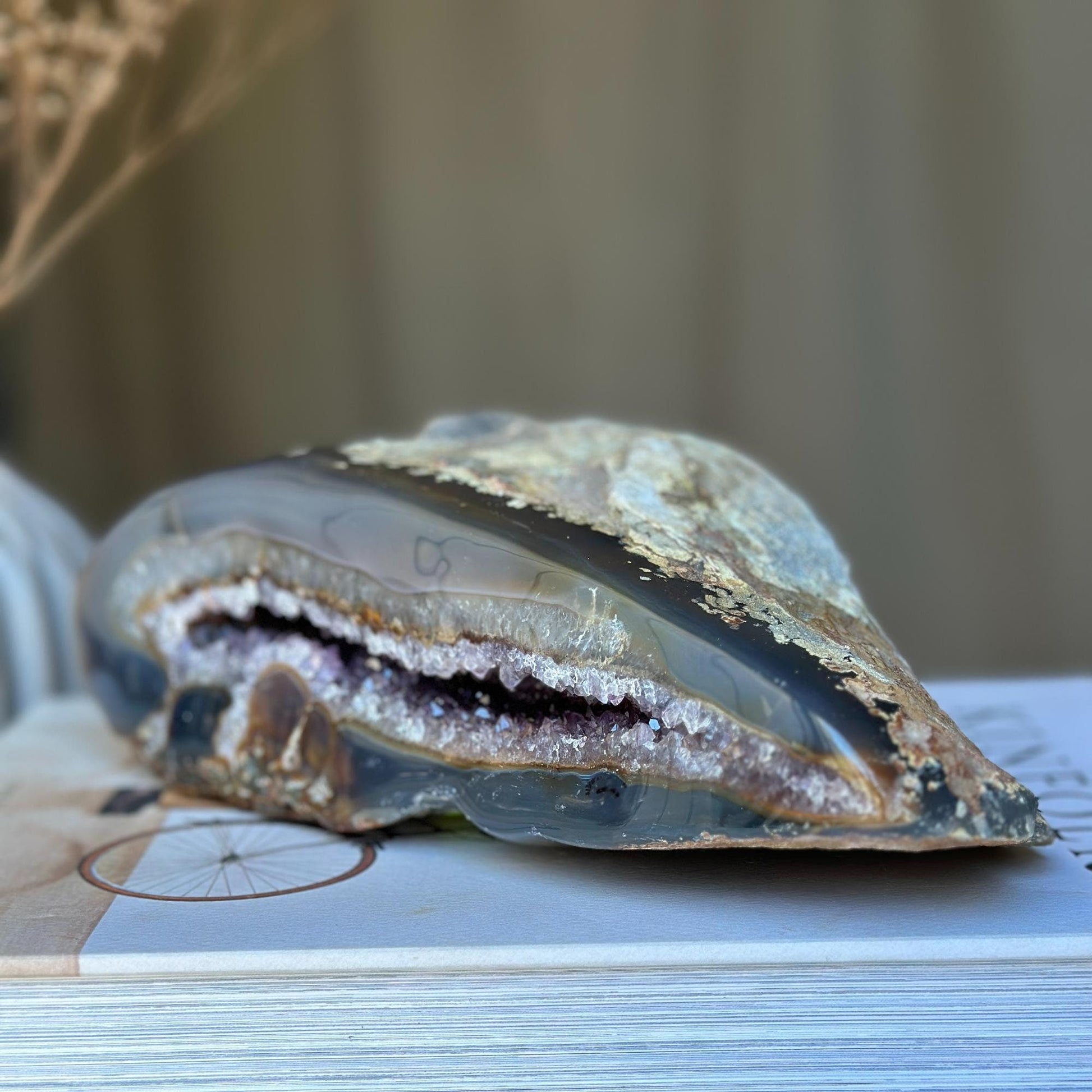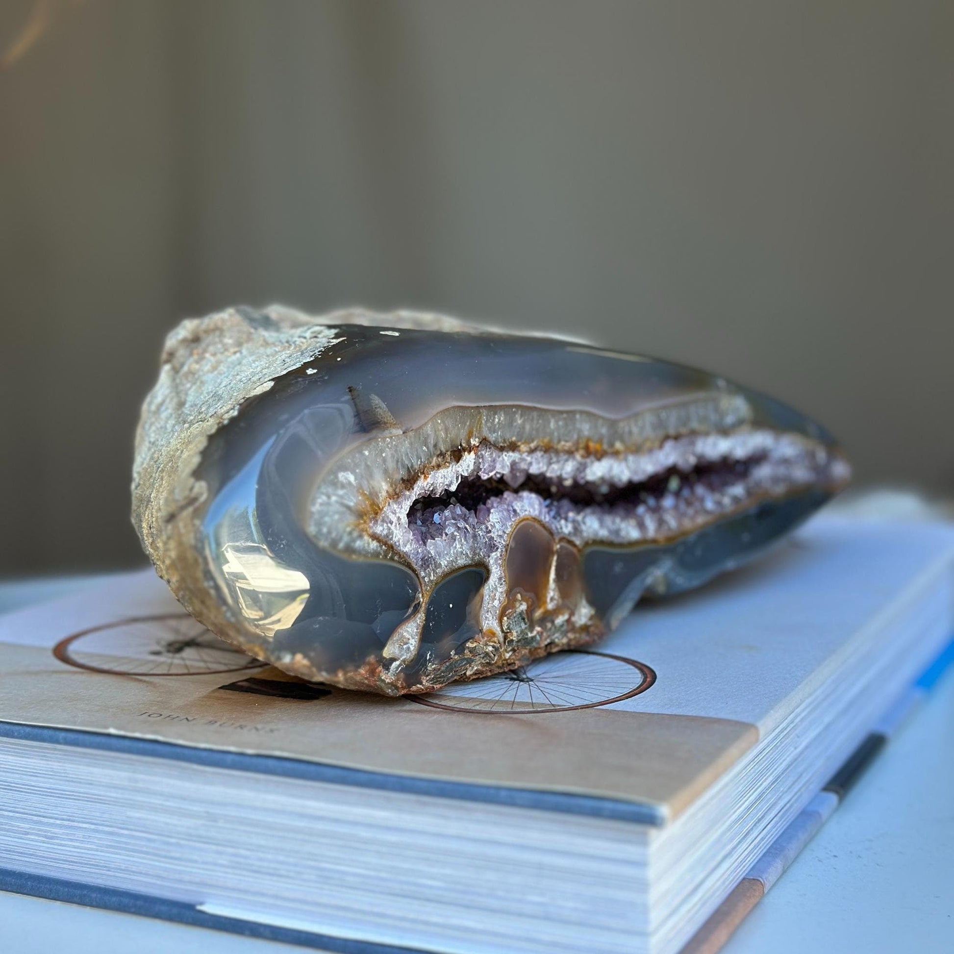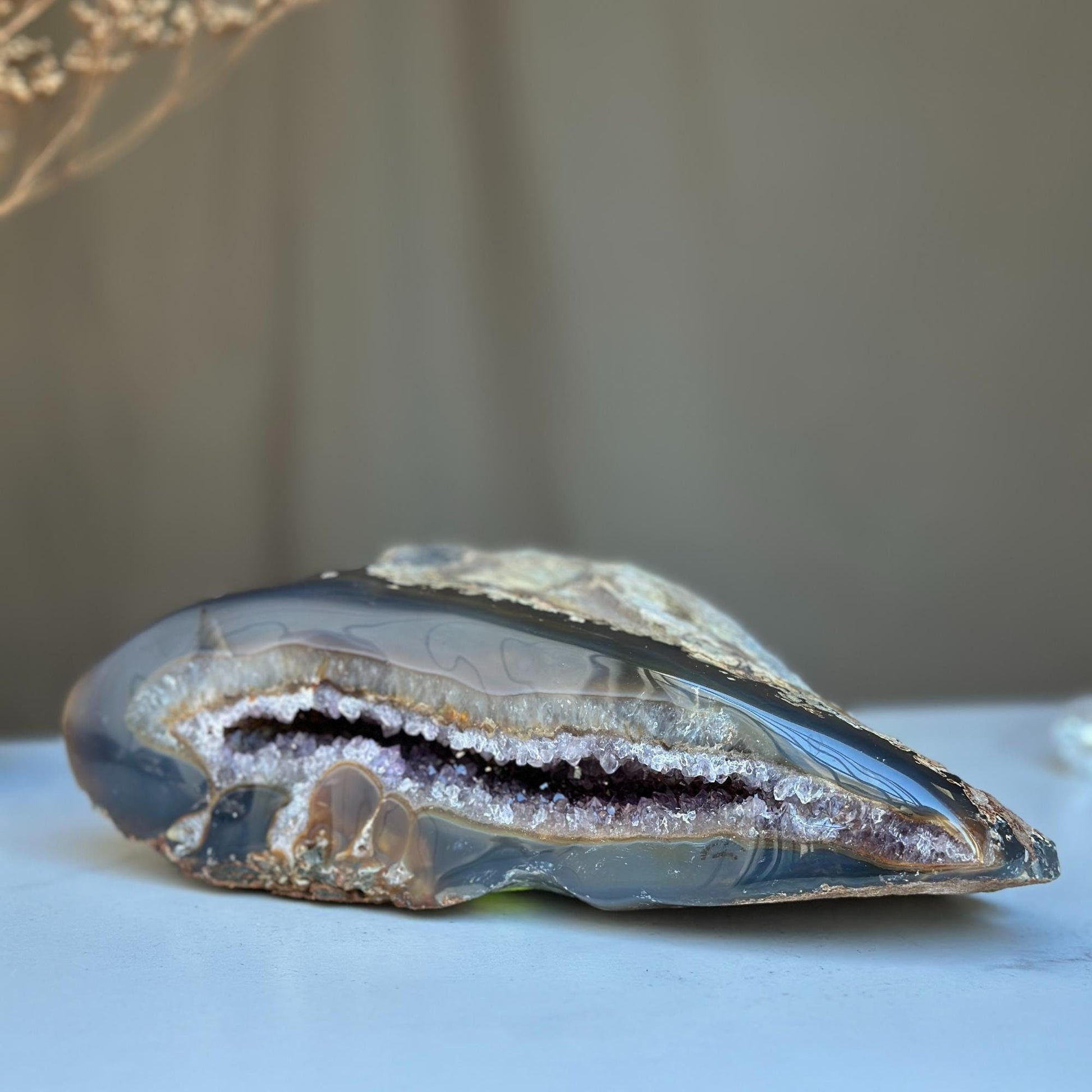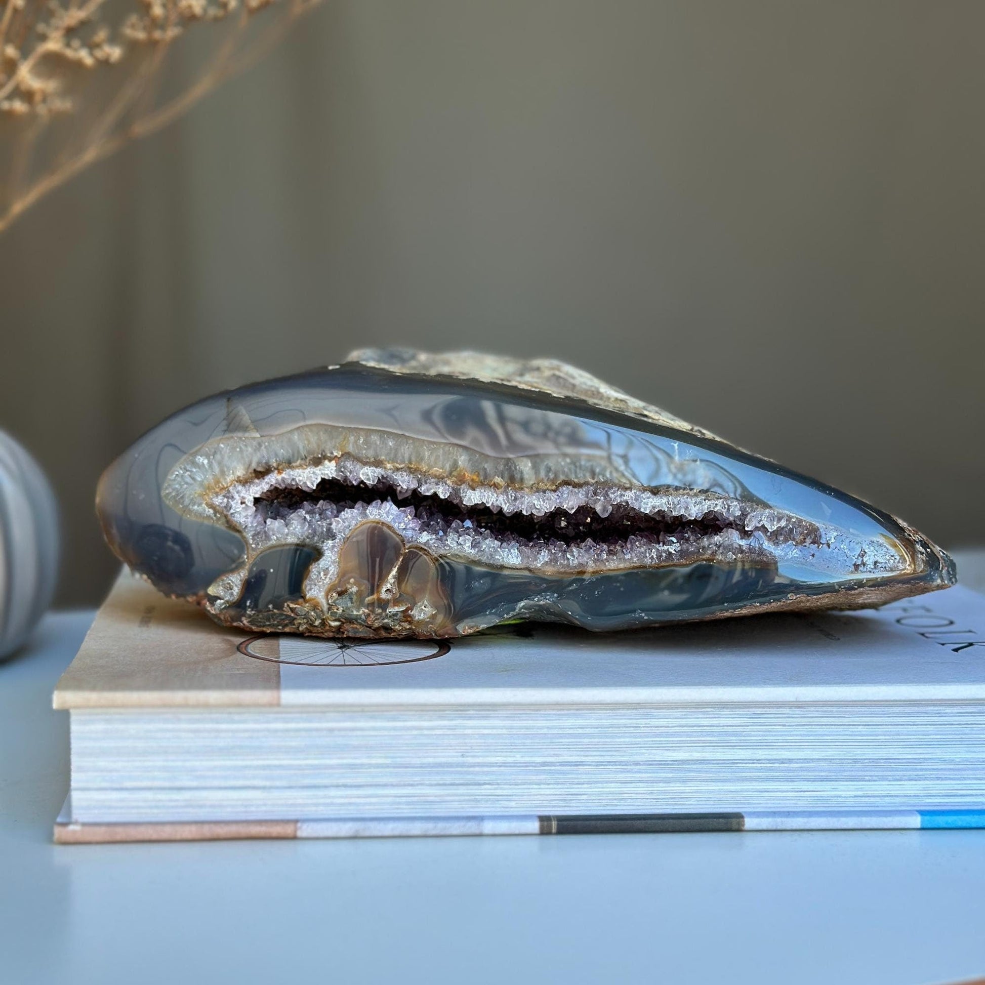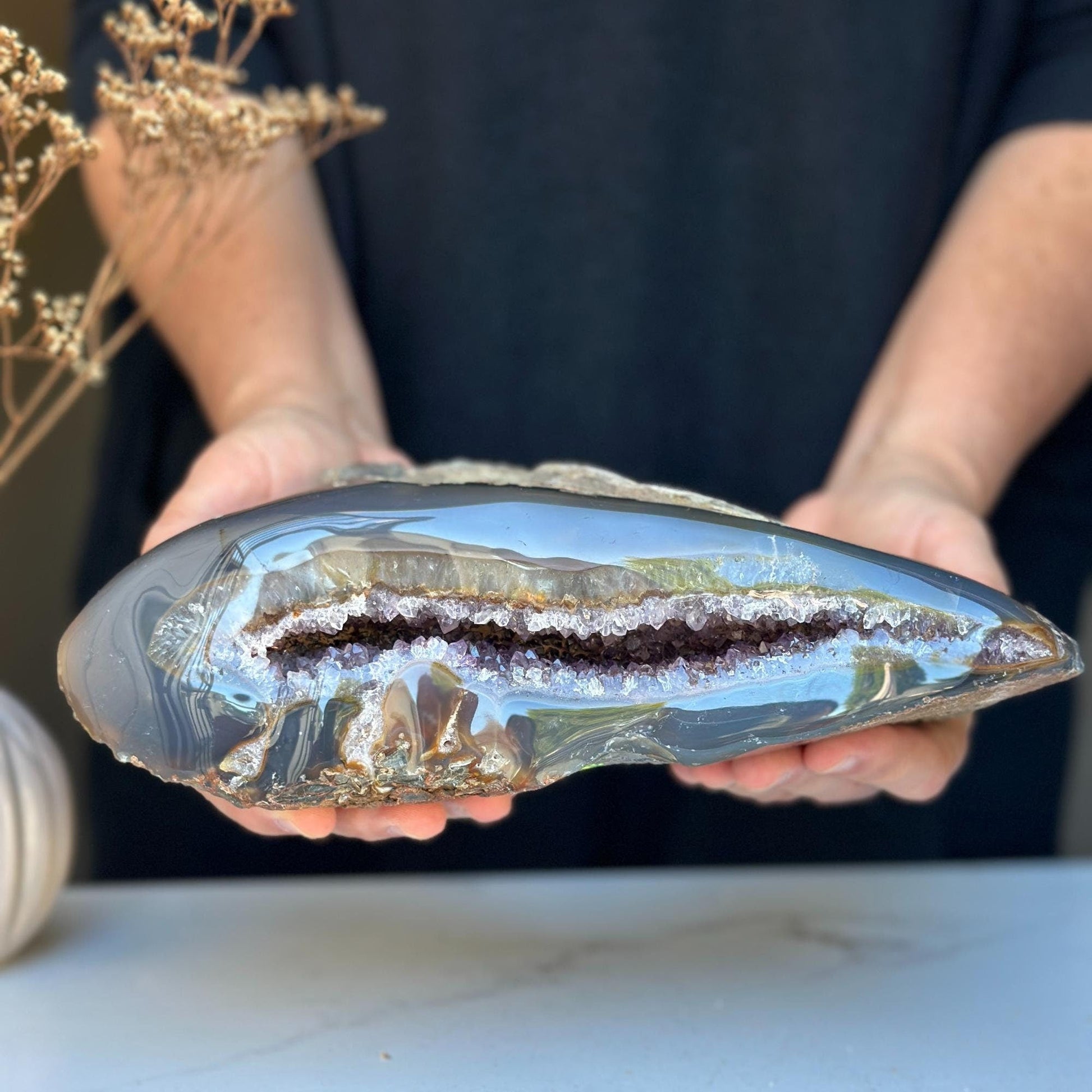 This agate and amethyst geode cave top table has the highest quality of the semi precious stones. It's a stunning decor crystal!!