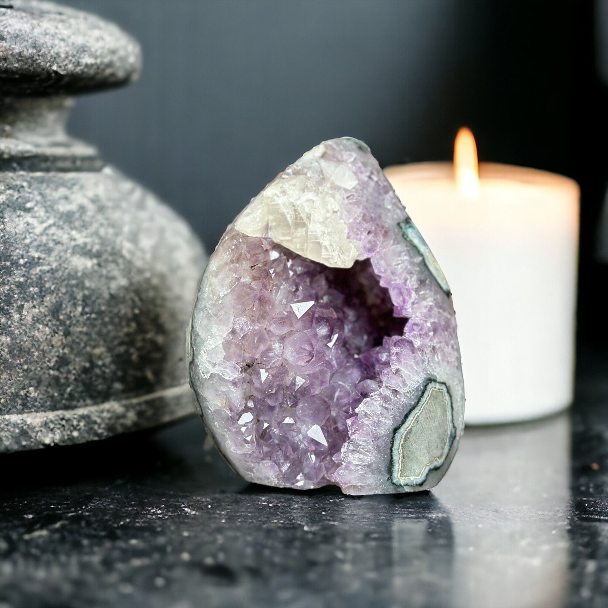 This flame geode is made from natural Uruguayan amethyst. It was carefully polished at edges to show the wonderful agate formations.