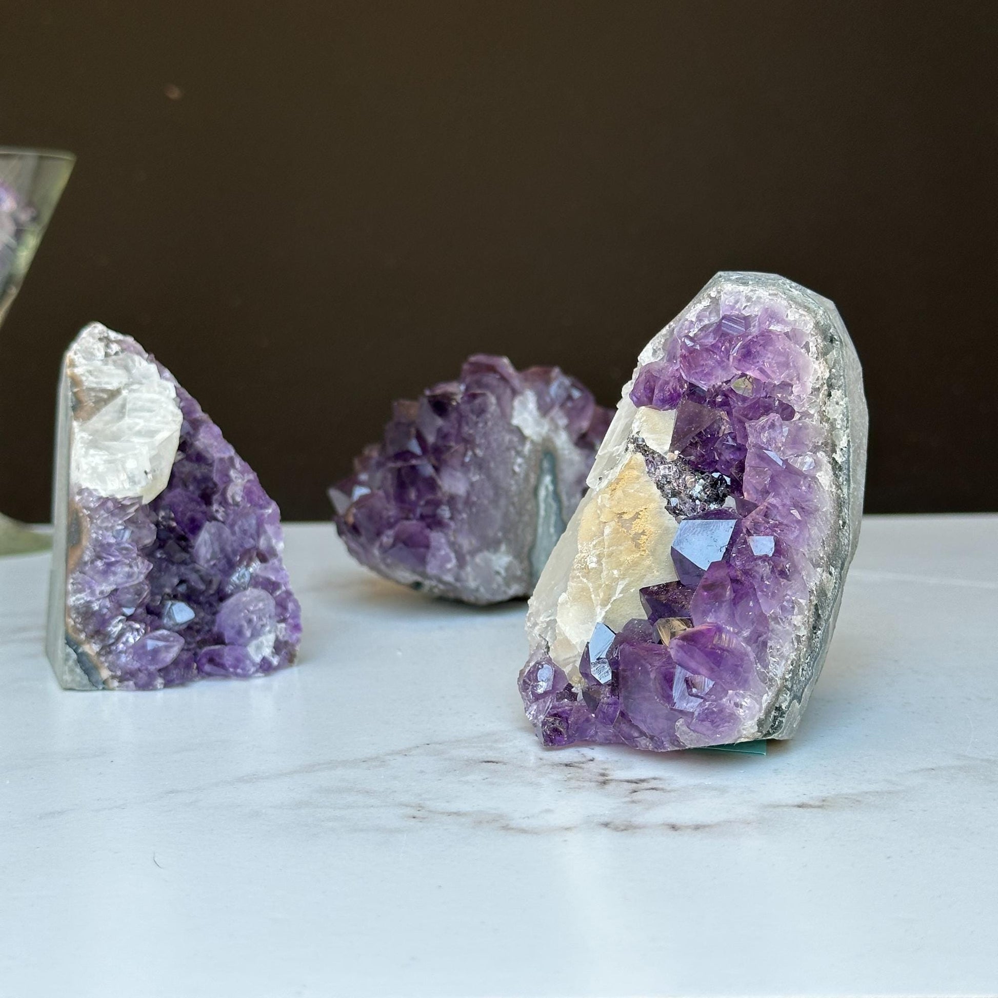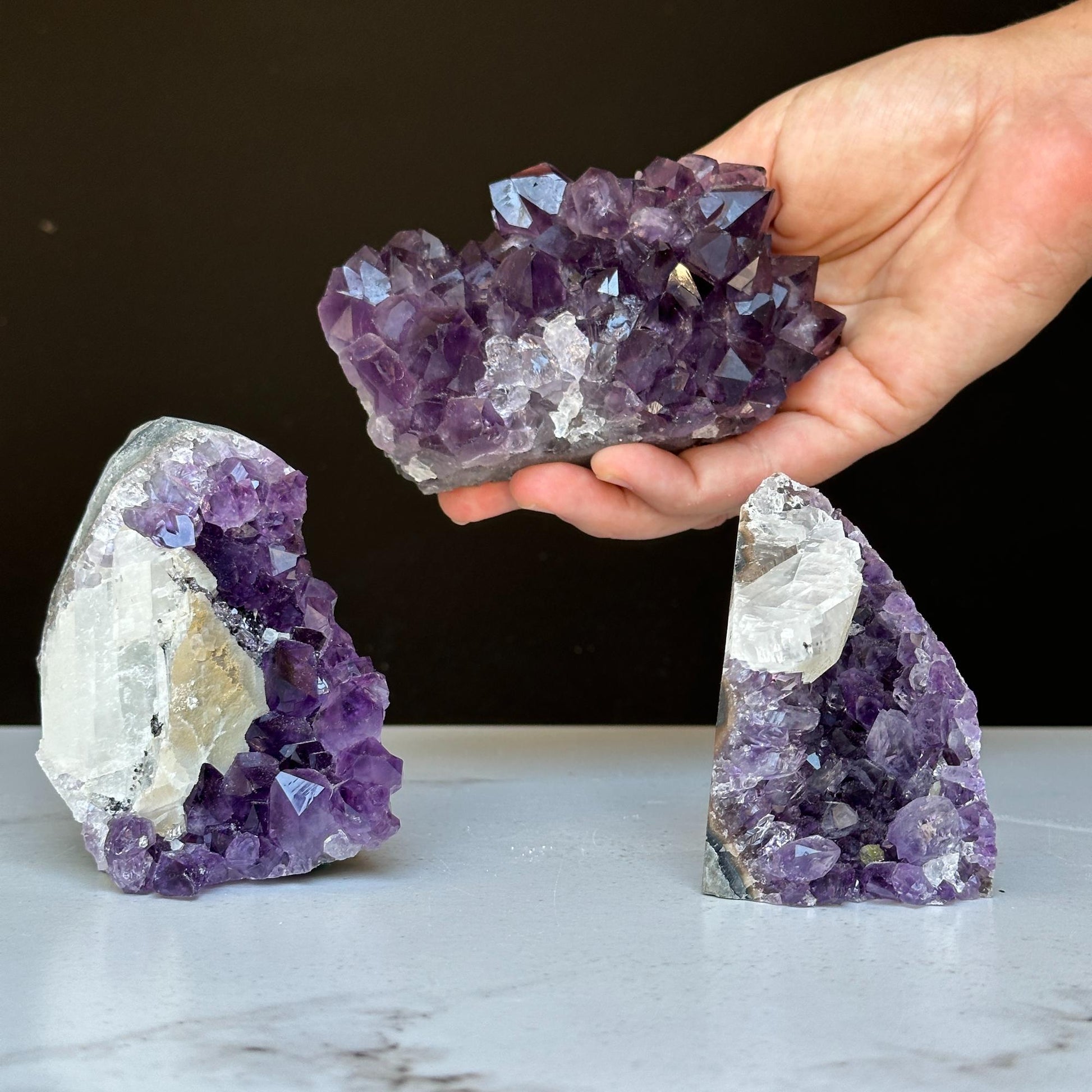 Amethyst set 3 pieces 3 Lbs approx, Medium Amethyst Cut Base Clusters with calcite formations