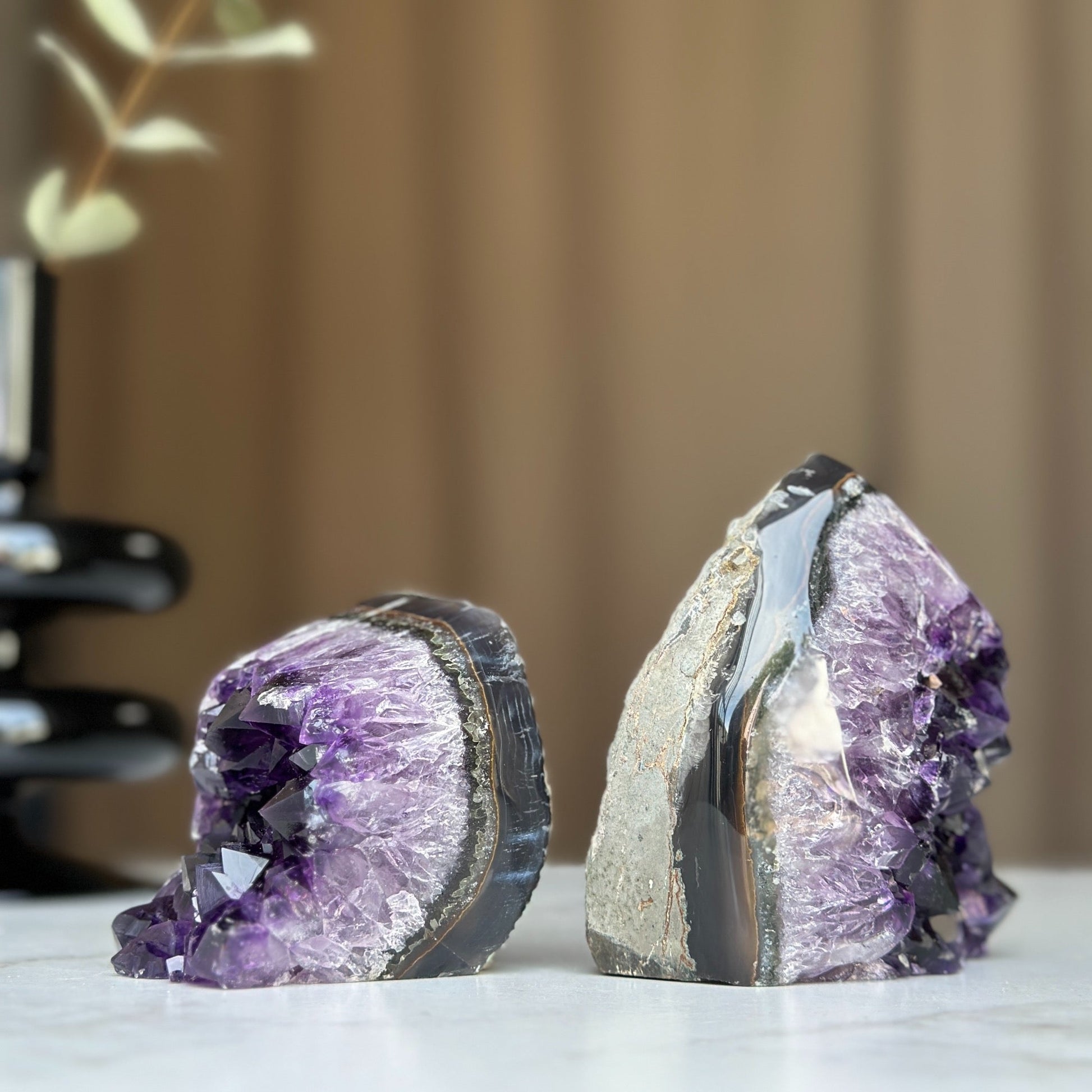 This set of 2 amethyst clusters has the highest quality of the semi precious stones.