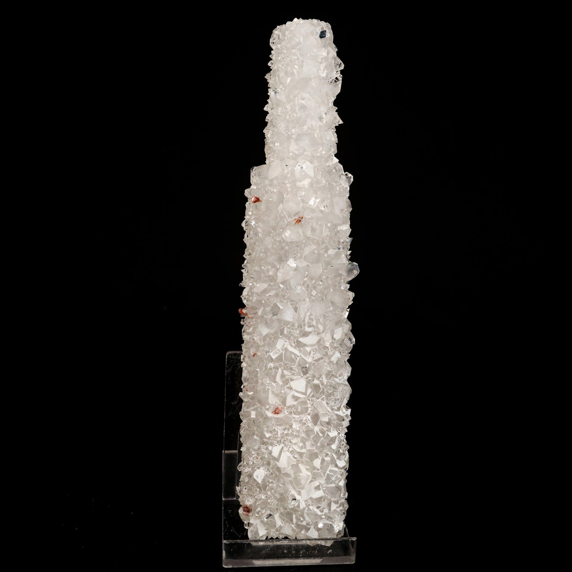 Lustrous transparent-to-translucent colorless Apophyllite crystals with translucent gemmy bladed coated calcite crystals covering the front face of a prismatic Apophyllite crystal that is coated with sugar-like Calcite microcrystals.