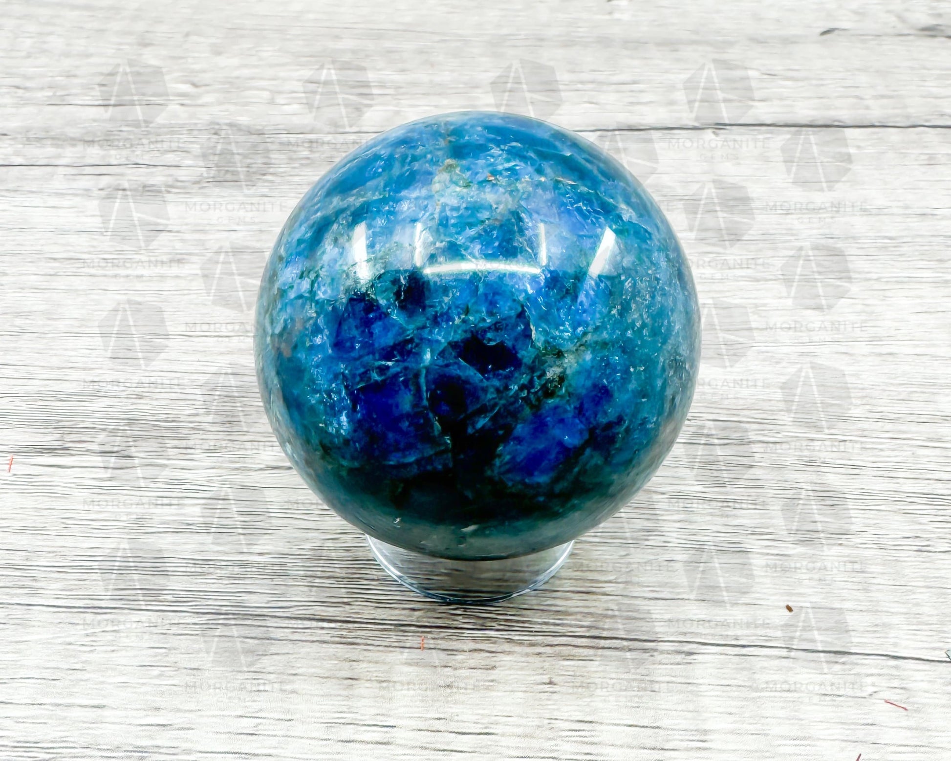 Enhance your collection with this mesmerizing Blue Apatite Sphere, weighing approximately 300 grams and measuring 2.25 inches in diameter. This beautifully polished crystal ball showcases the vibrant, deep blue hues characteristic of high-quality Apatite, with intricate patterns that seem to shift and change as the light hits its surface.