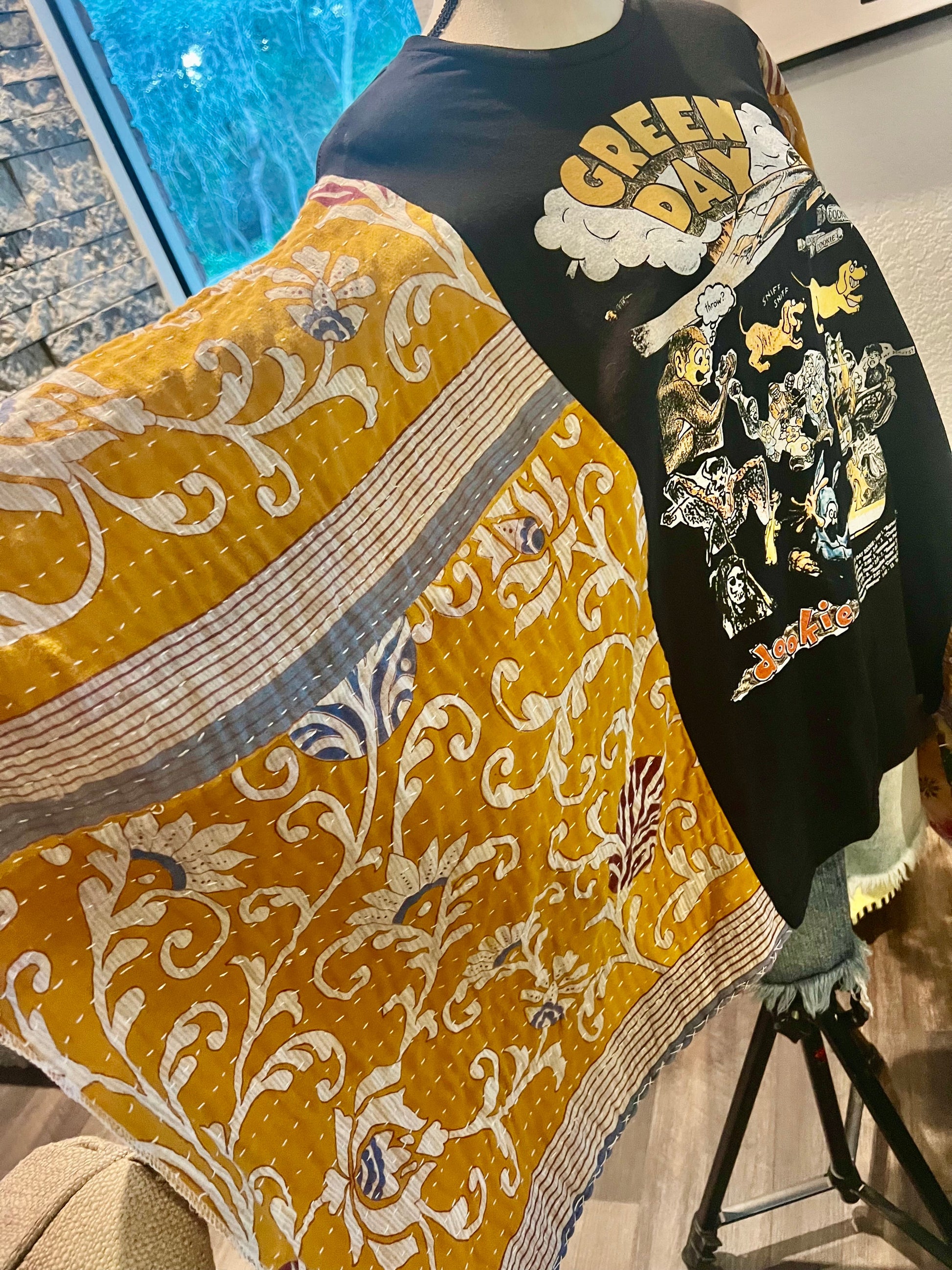 Rock nostalgia meets boho charm in this one-of-a-kind Butterfly top. Featuring an Green Day graphic tee, this piece is transformed with bold kantha quilt sleeves that bring color, texture, and a free-spirited vibe. The relaxed, poncho-style cut makes it effortless to throw on with denim shorts, jeans, or leggings.