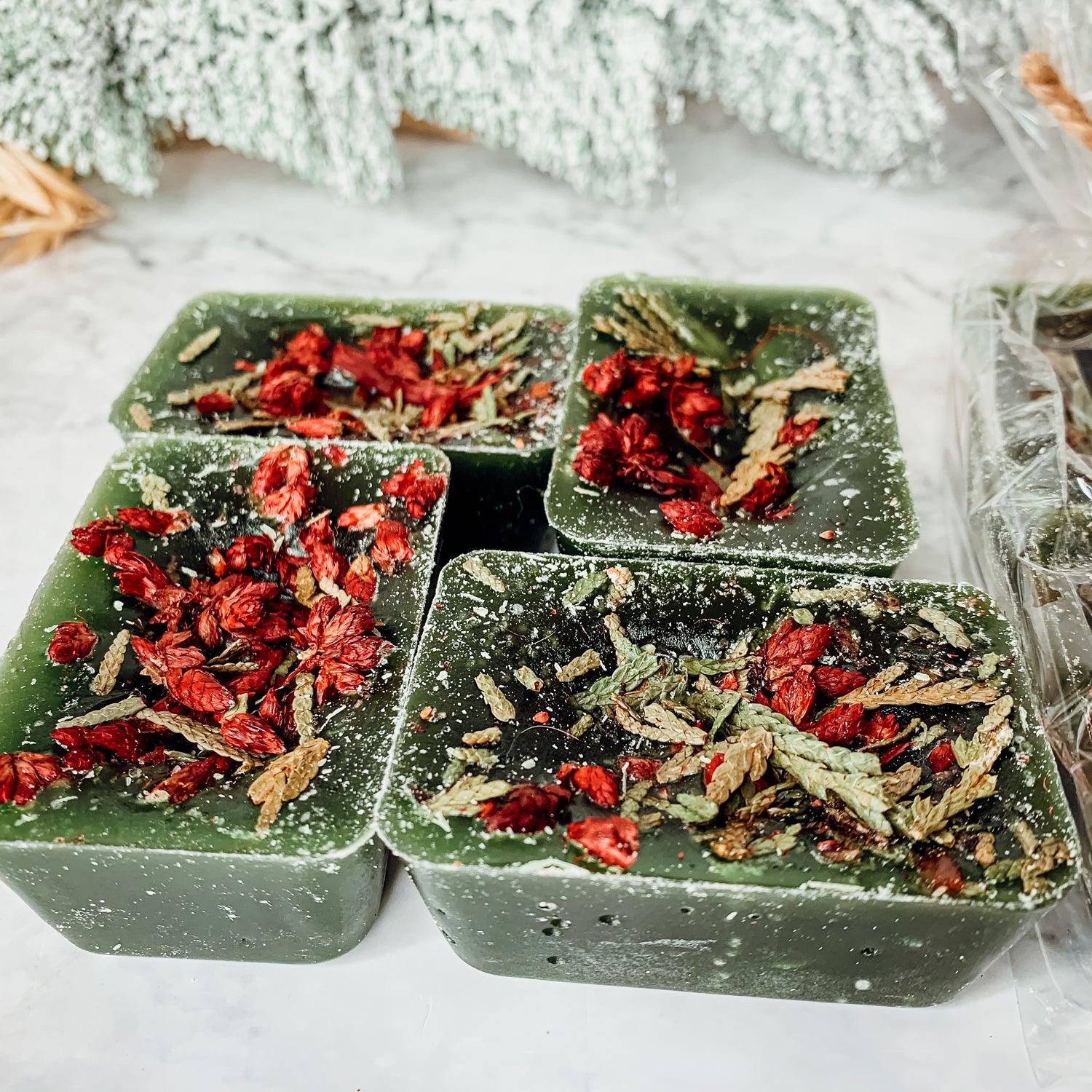 A combo of Cranberry Sugar, Wood Cabin + Prairie Blossoms. Topped off w/ fresh cedar tips and botanical goodies.