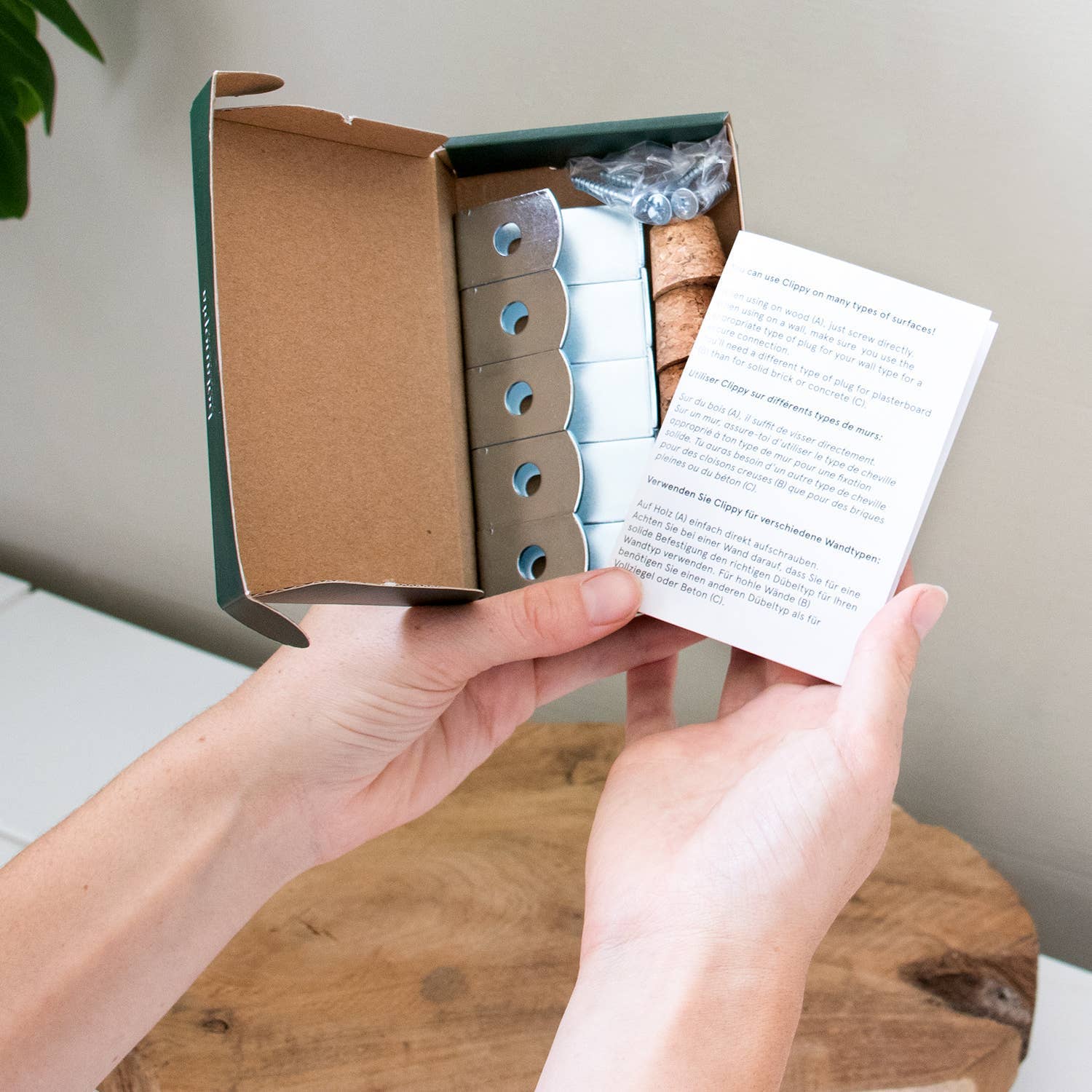 Clippy is easy to use. Screw the clip into the wall with the mounting screws (included) and slide your pot onto it. You’ll need a pot with a rim to do so, most classic terracotta pots have one.