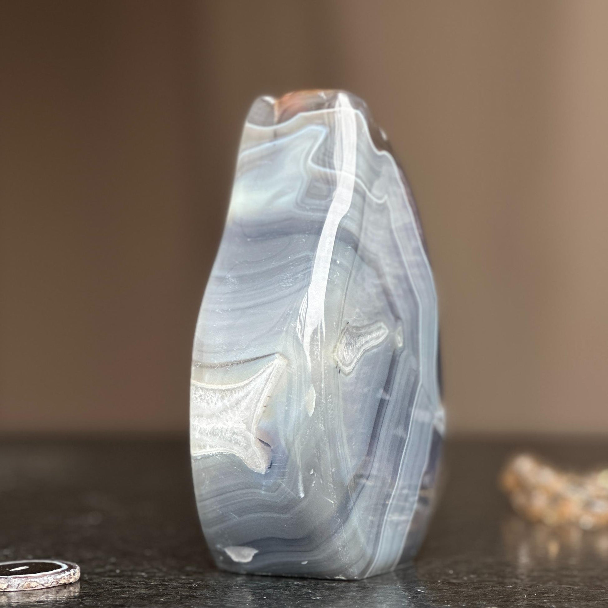 This is a unique gray and brown agate flame, perfect for displaying in a reception table or desk.