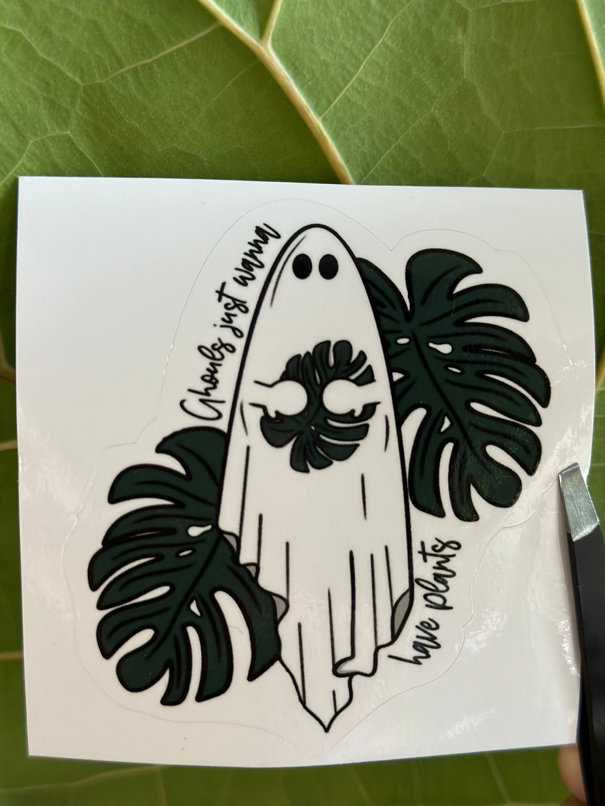 Cute ghost with monstera leaves waterproof sticker for plant lovers, plant lady, plant mama.