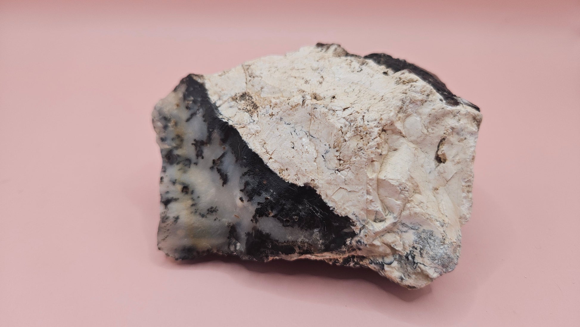 Add a captivating contrast to your collection with this dramatic Dendritic Opal specimen. With its tree-like inclusions dancing through milky and smoky tones, this raw piece brings a bold and earthy elegance straight from nature.