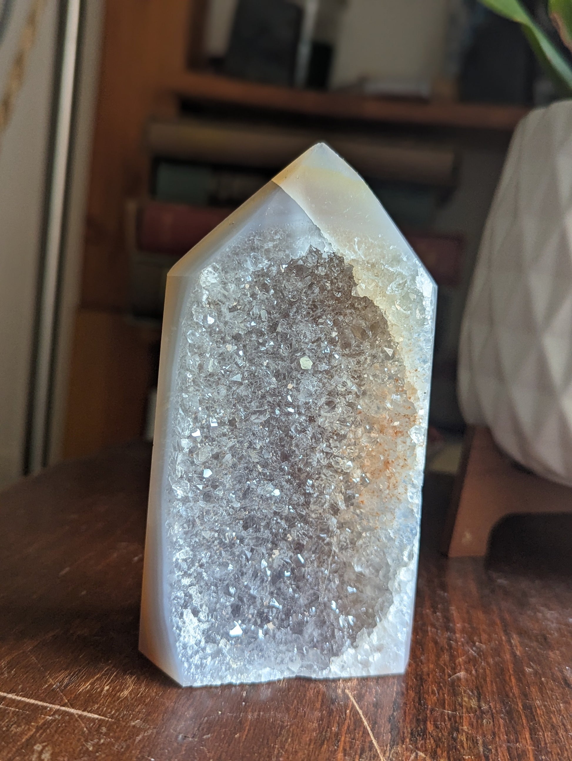 - Fully carved and polished on the back with a rough druzy Crystal front