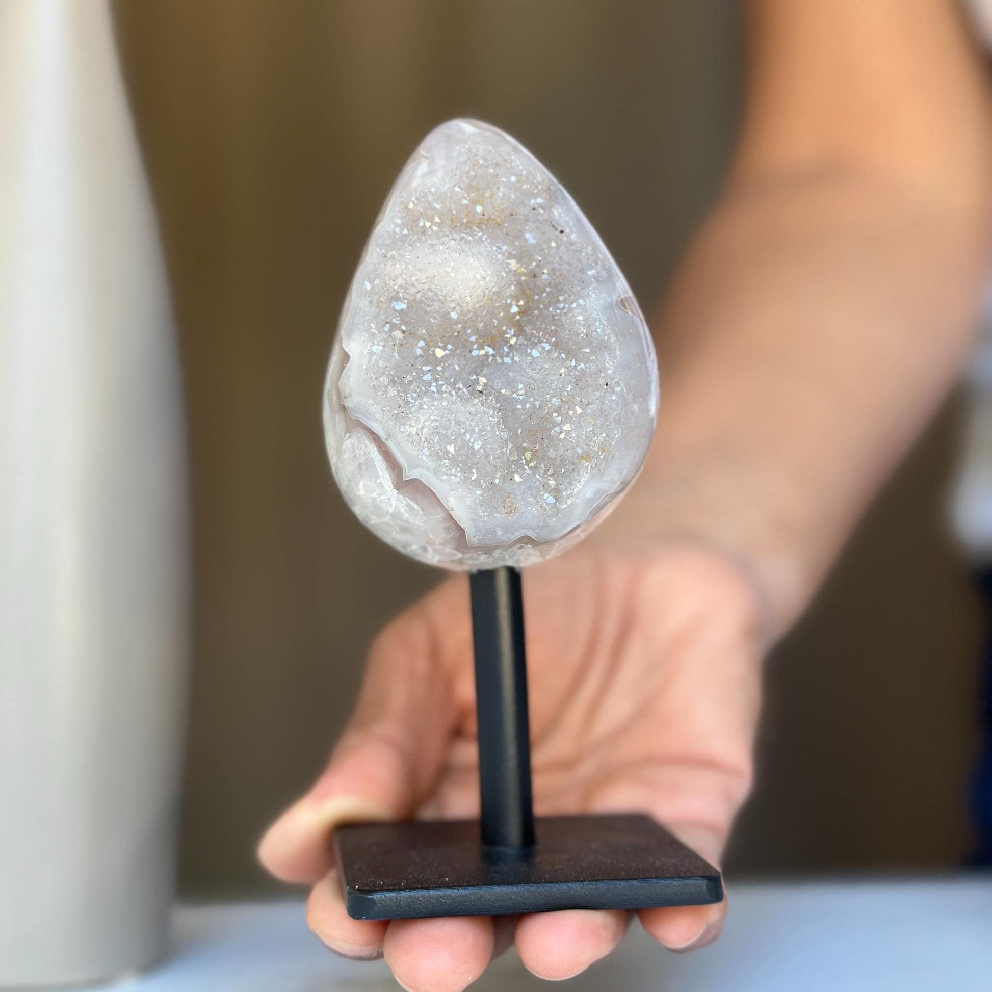 These incredible agate and amethyst egg-shaped crystals with metal stand have the highest quality of the semi precious stones. Its colors are 100% natural.