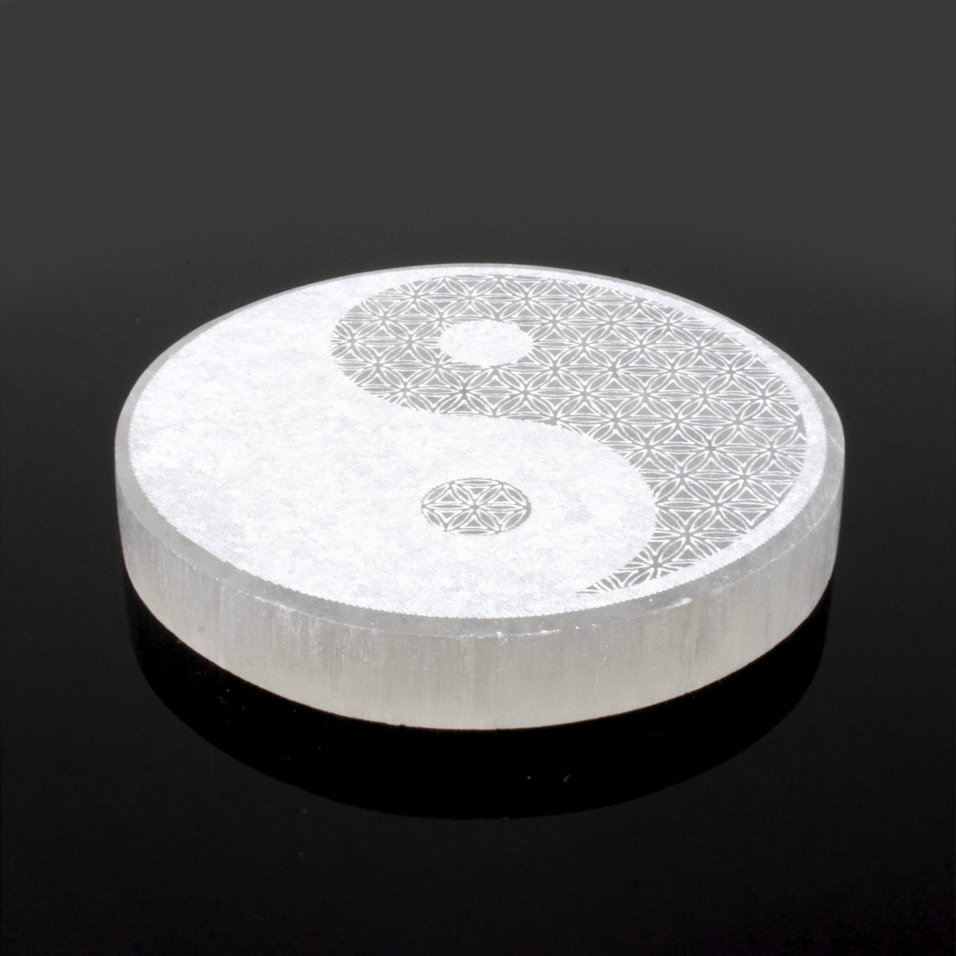 Selenite Disc - Engraved Yin Yang (Morocco) - Sacred Geometry - Sustainably Harvested