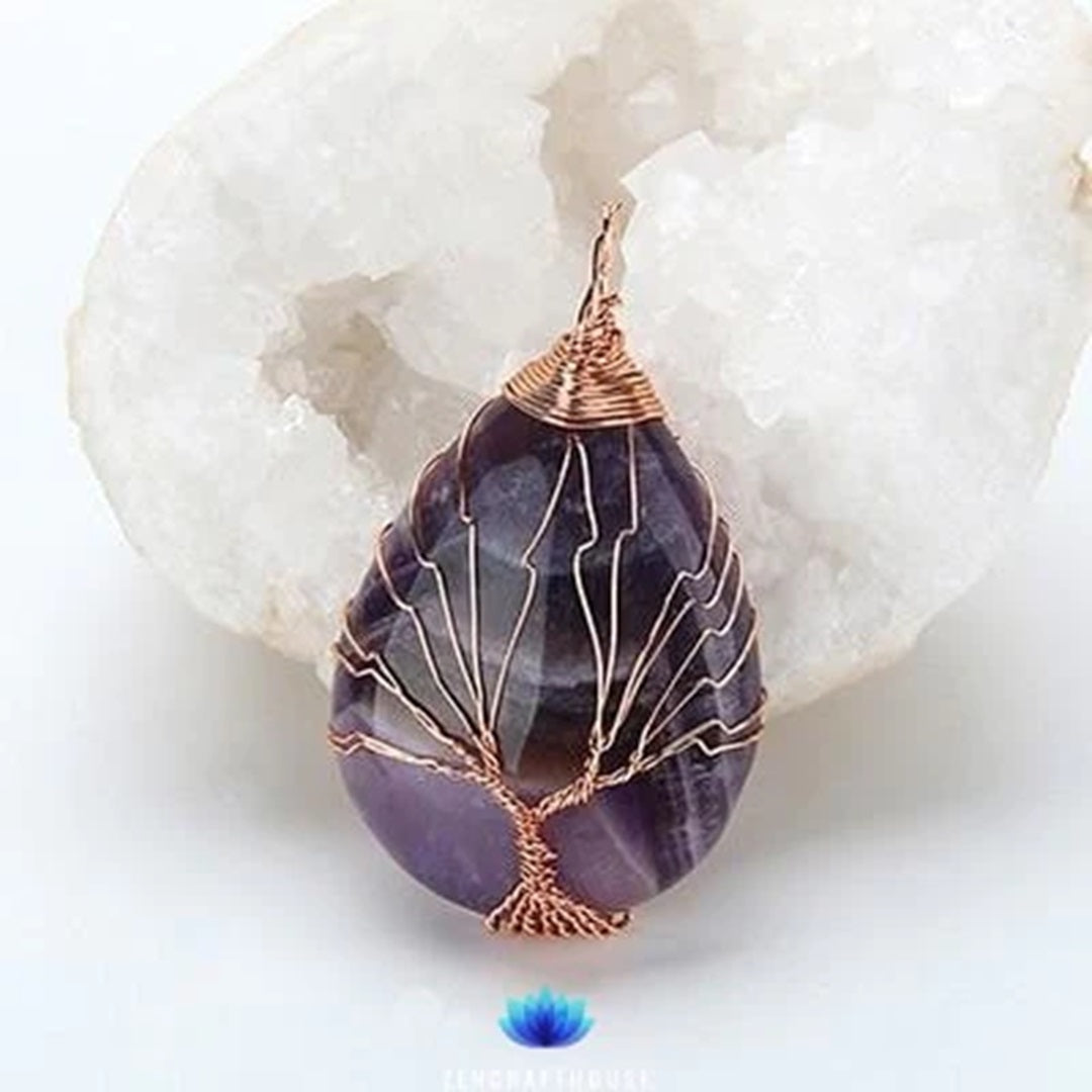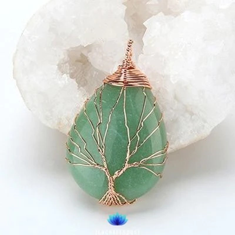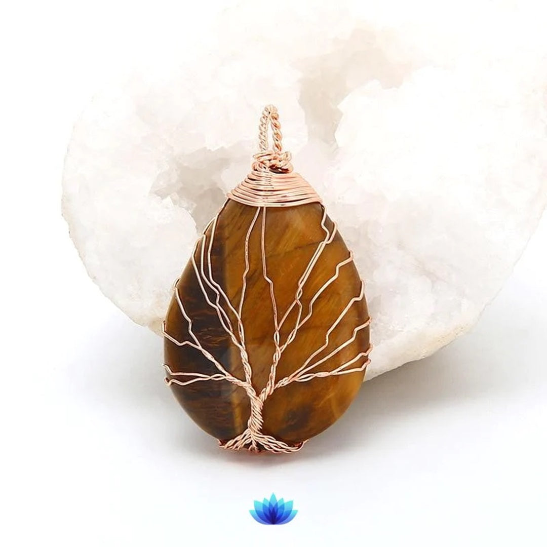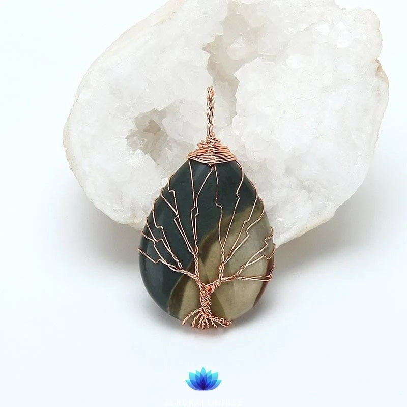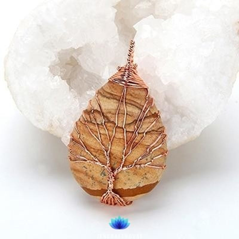 Our Eternity Jasper Tree of Life Necklace showcases an elegant teardrop-shaped natural stone, wrapped in copper wire to create the Tree of Life.