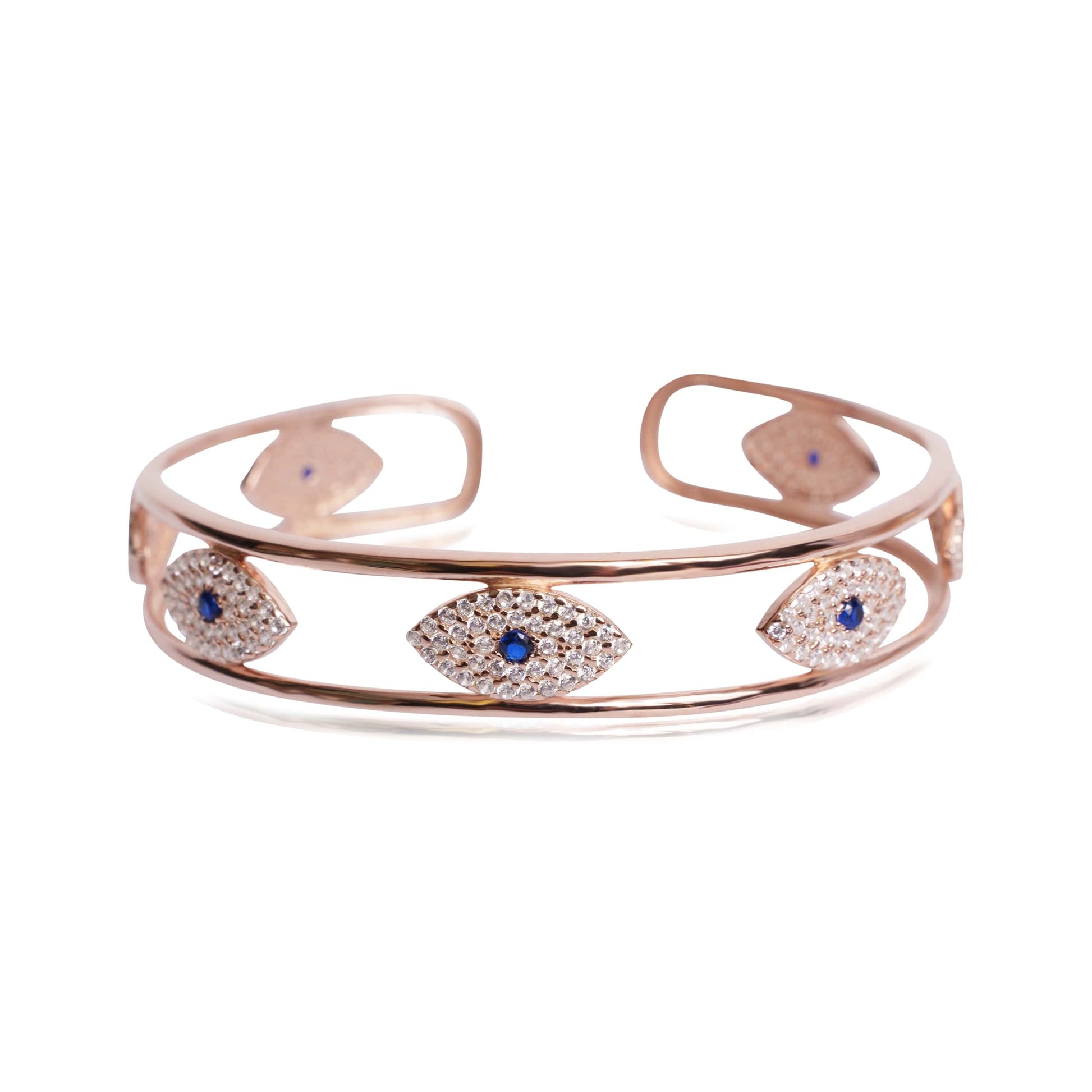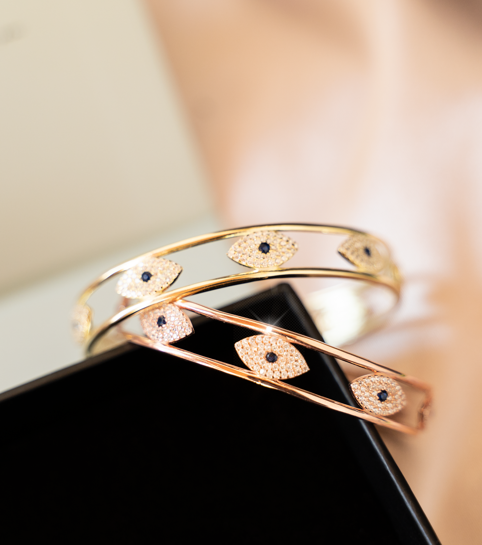 This cuff is everything! Add good luck and keep bad vibes away with this bangle. Sparkling cubic zirconia embellished evil eyes are framed by shiny rails of rich yellow gold plating, giving the bracelet a statement style.