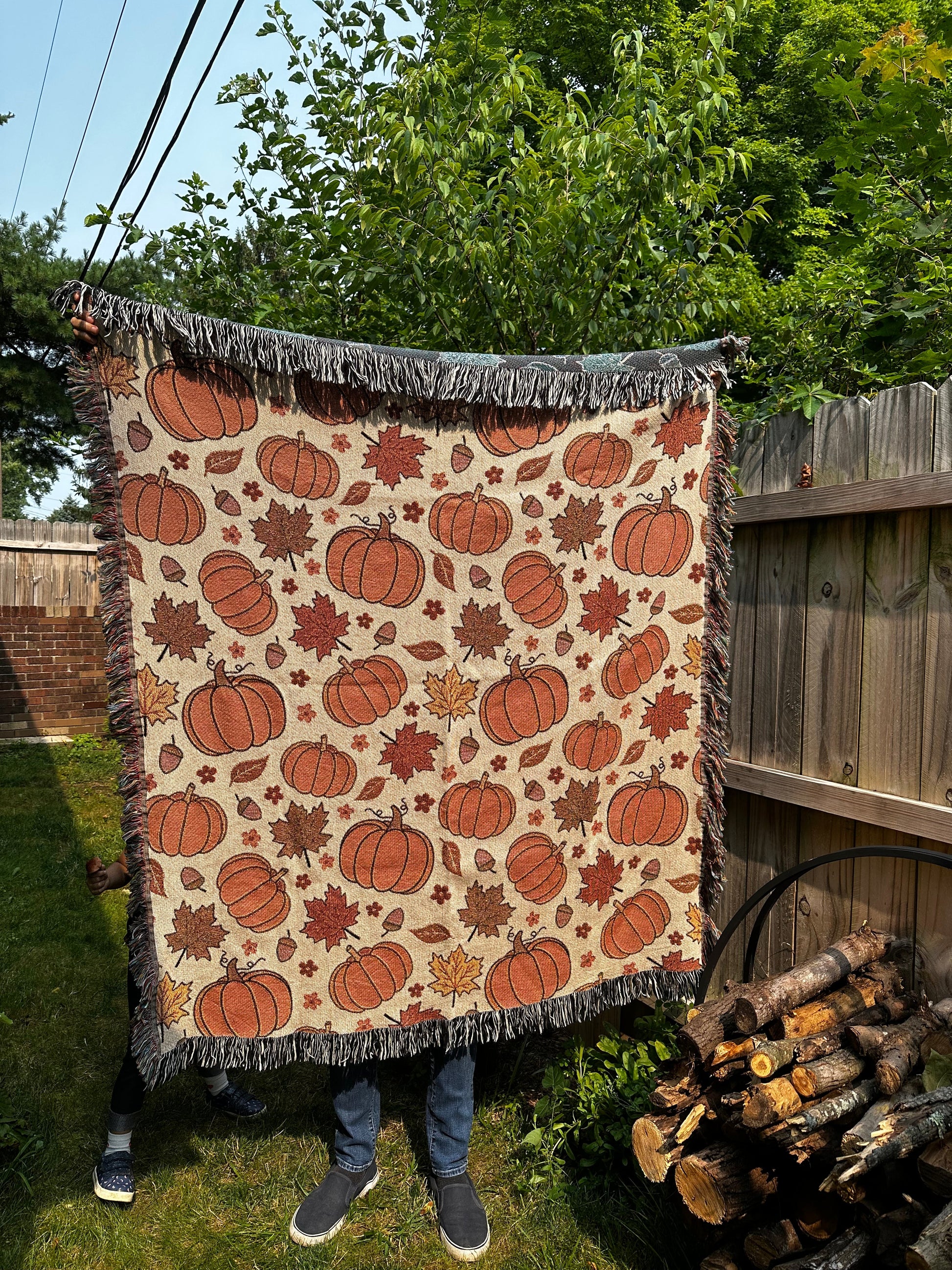 Fall Woven Blankets with pumpkin and autumn leaves.