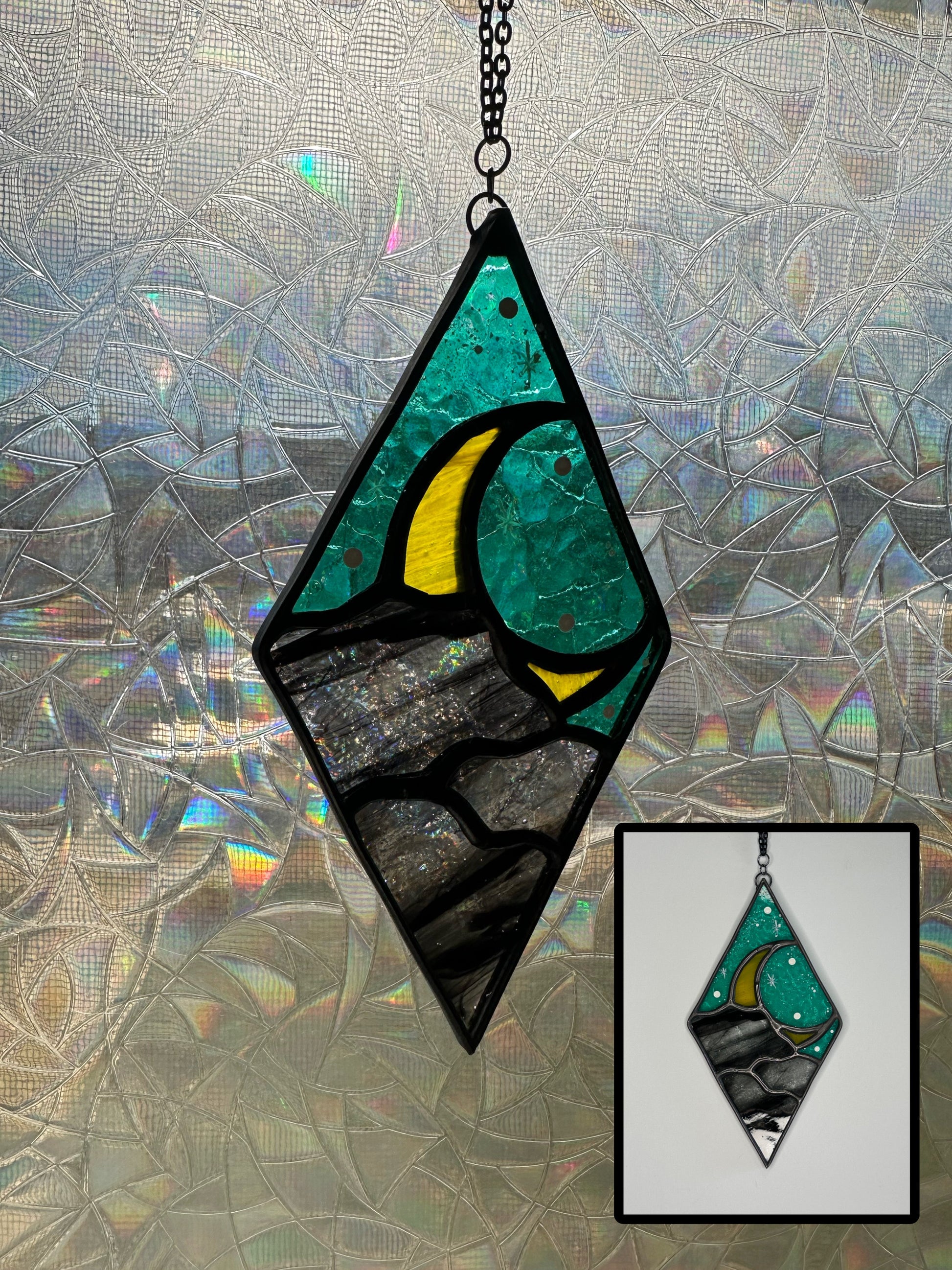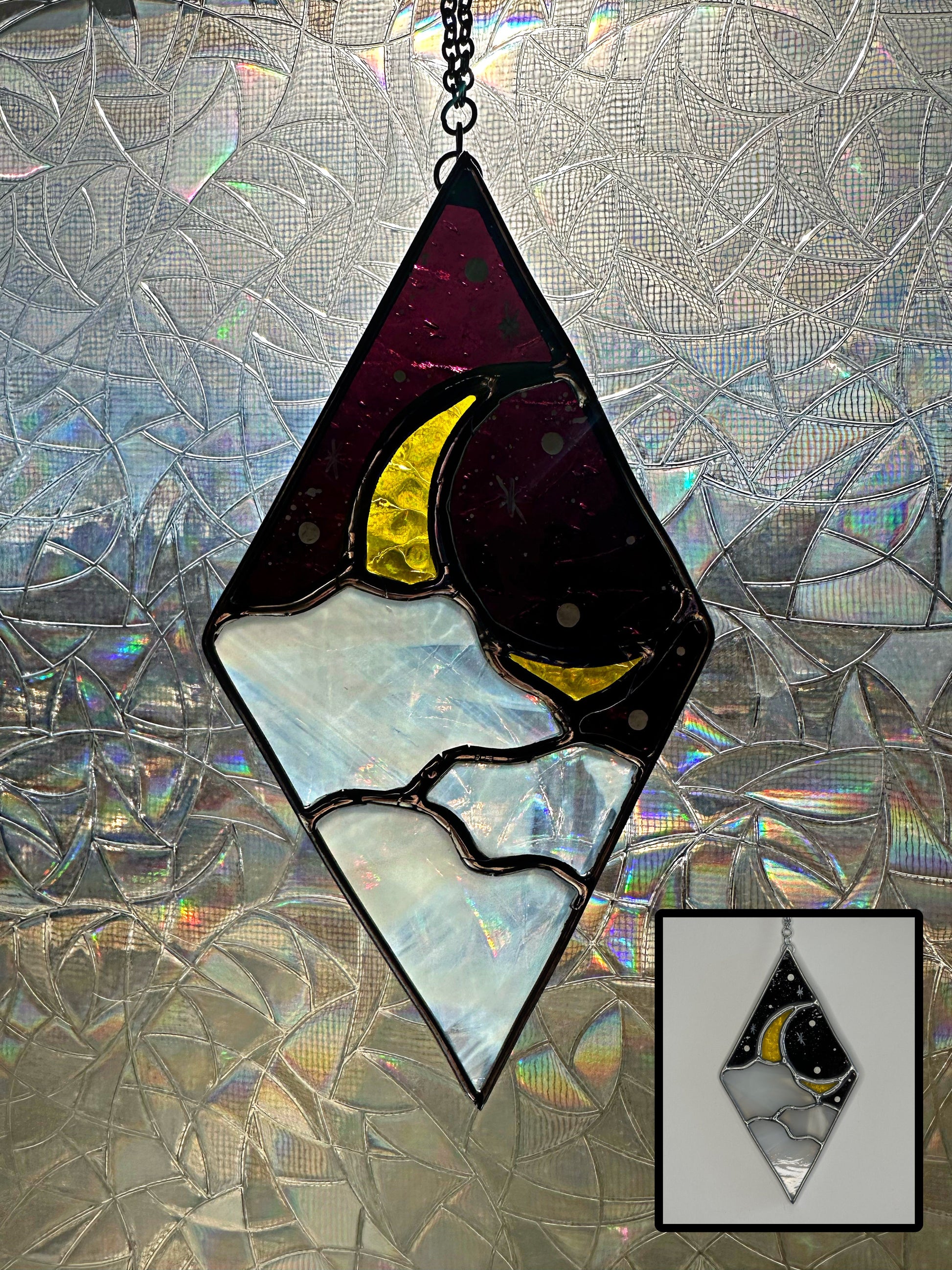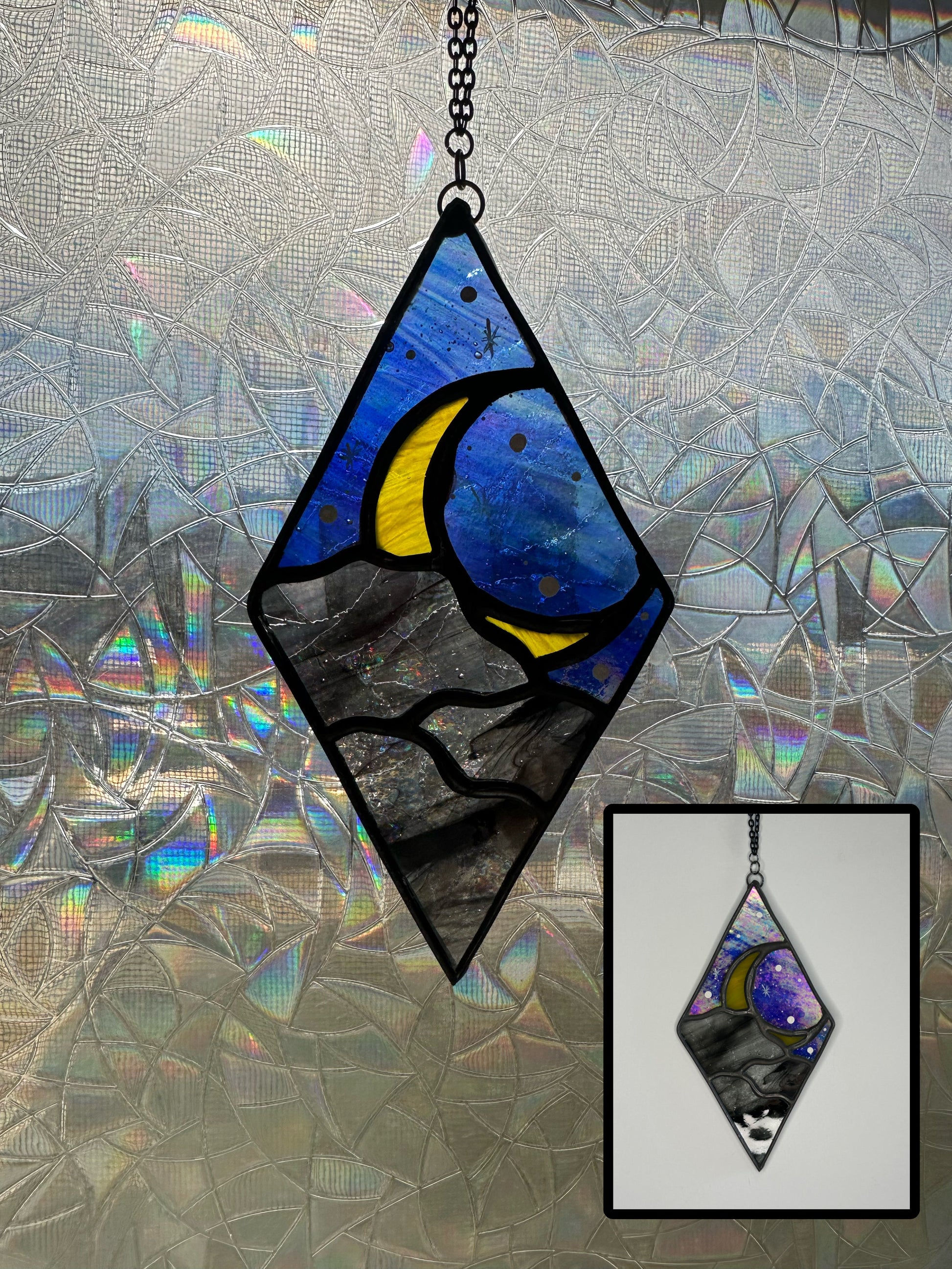 Bring the mysterious charm of a foggy night into your home with our "Foggy Night" stained glass suncatcher. Featuring hand painted intricate details, this suncatcher is sure to add an enchanting touch to any room. (Moon shines bright, no matter the weather!)