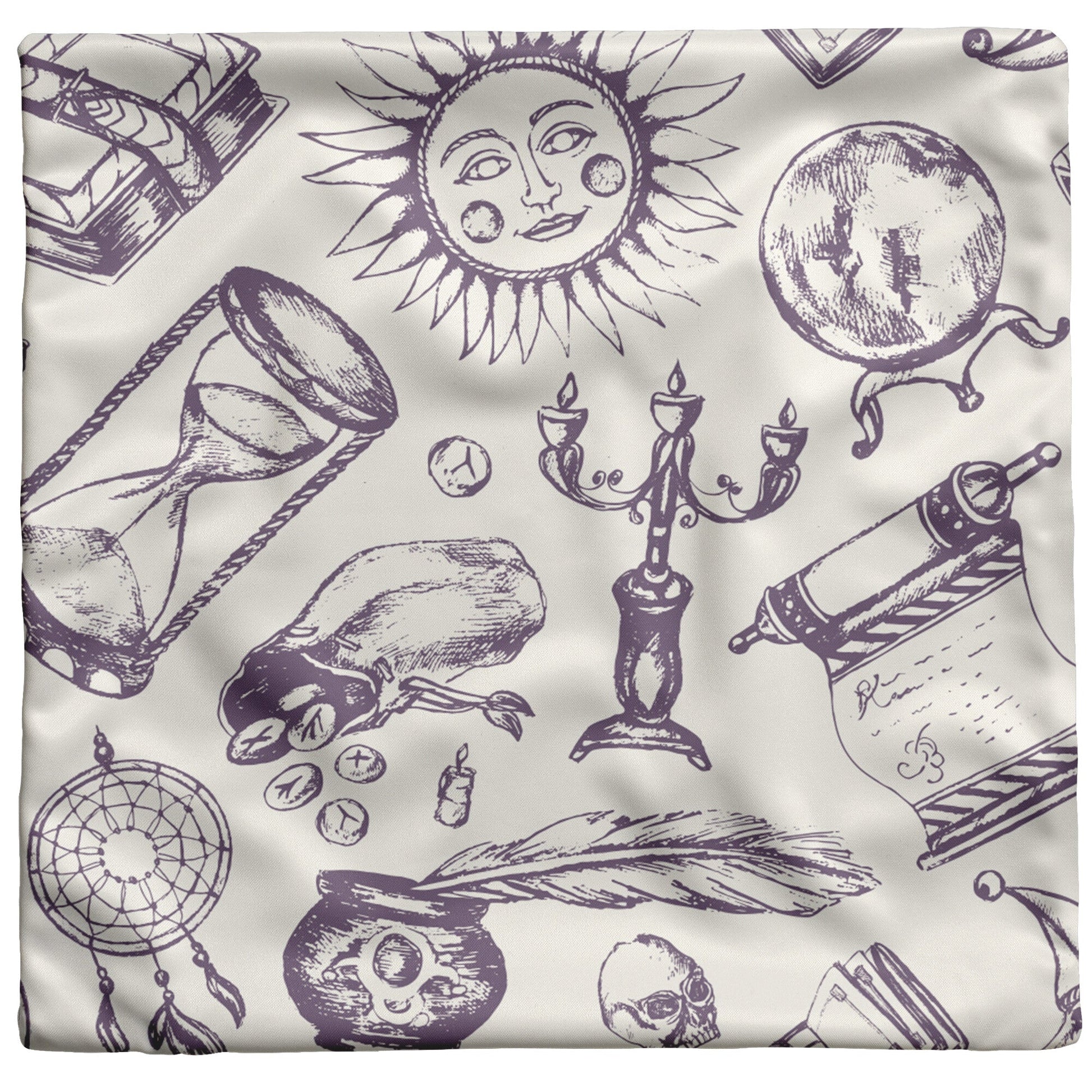 Step into the mystical realm with our “Fortune Teller” square throw pillow, adorned with hand-drawn illustrations of candles, scrolls, spell books, crystal balls, writing quills, divination runes, dreamcatchers, and the sun.