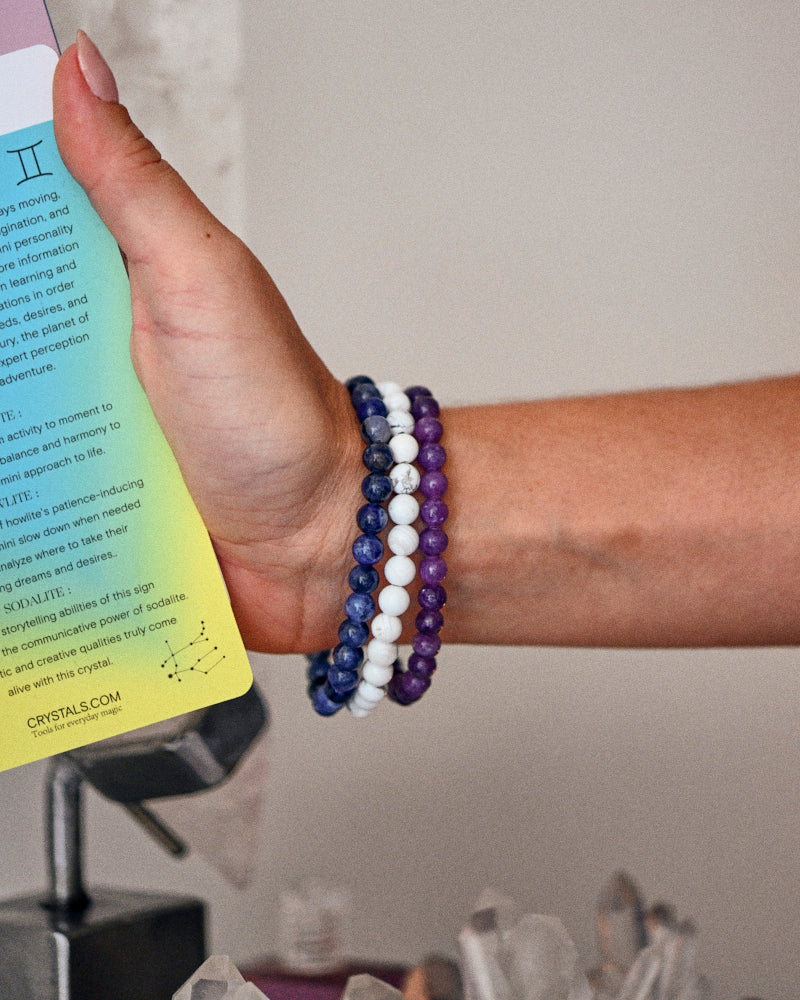 Our Gemini Bracelet Trio is the perfect accessory for anyone born under this curious and communicative zodiac sign. This bundle kit includes three stunning bracelets made with high-quality crystals: Lepidolite, White Howlite, and Sodalite.