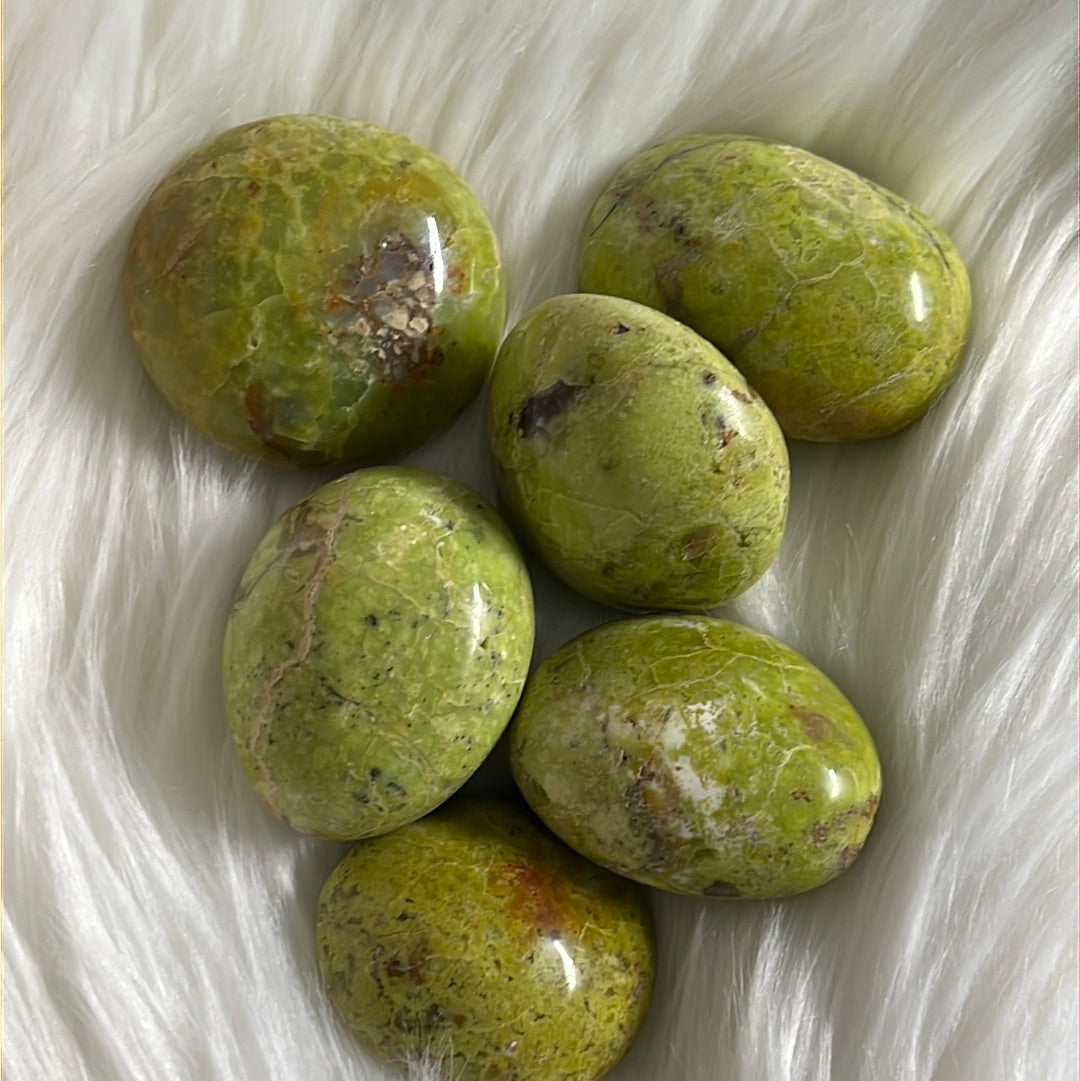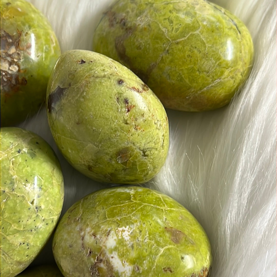Our green opal tumble stones are unique in shape and approximately 2.5 inches in diameter.