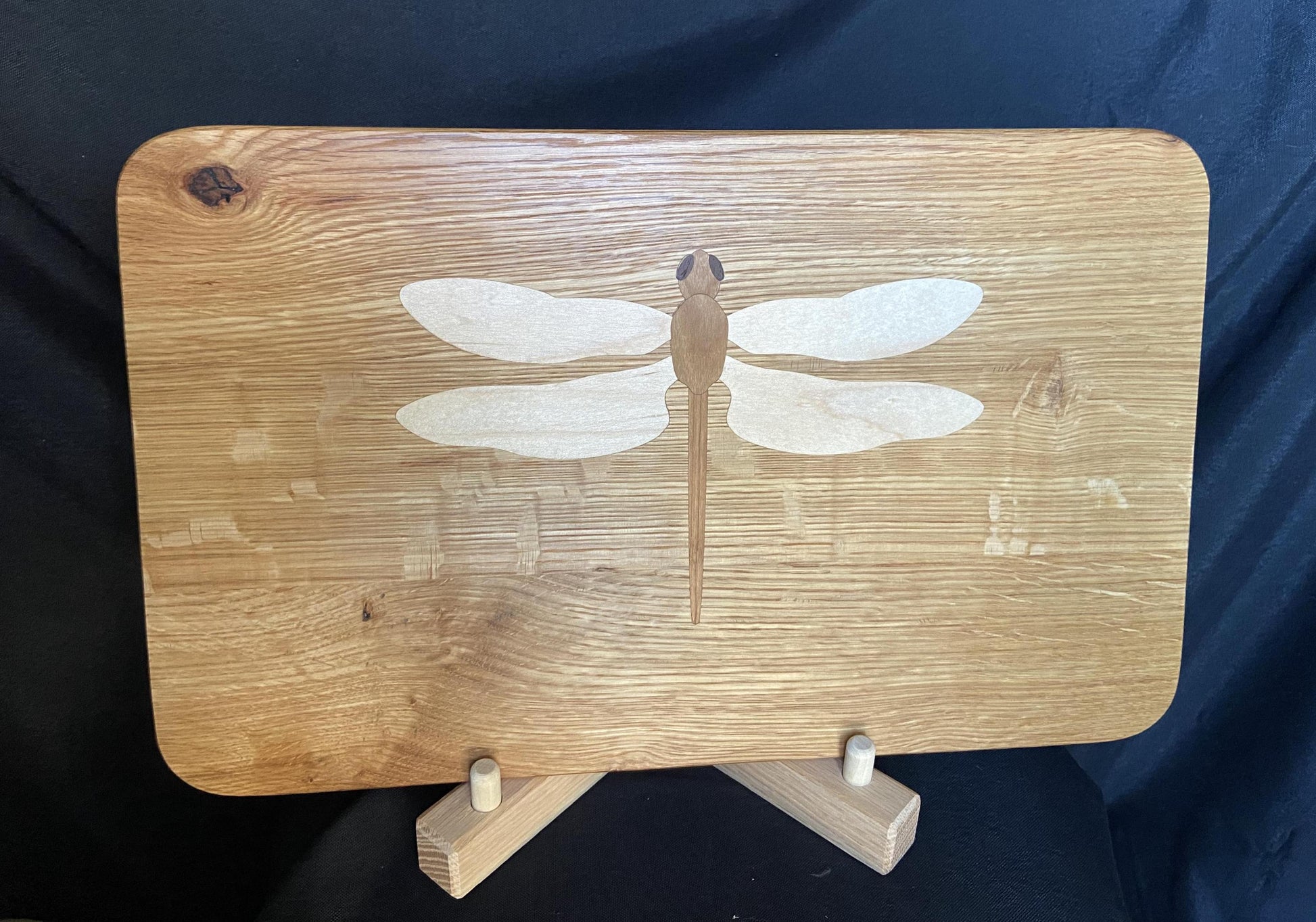 Hand-made art on a wooden canvas. White Oak charcuterie board; dragonfly inlay of Cherry, Maple and Peruvian Walnut.