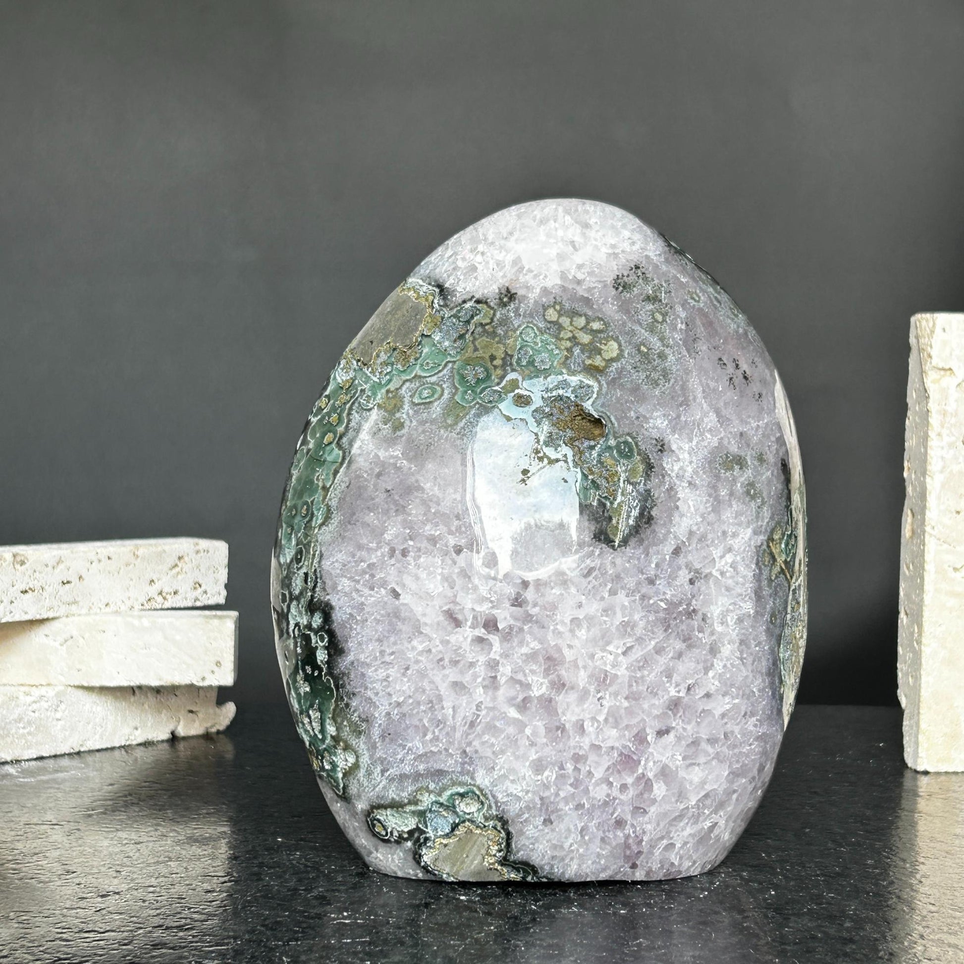This amethyst and agate geode egg is perfect for displaying in a reception table.