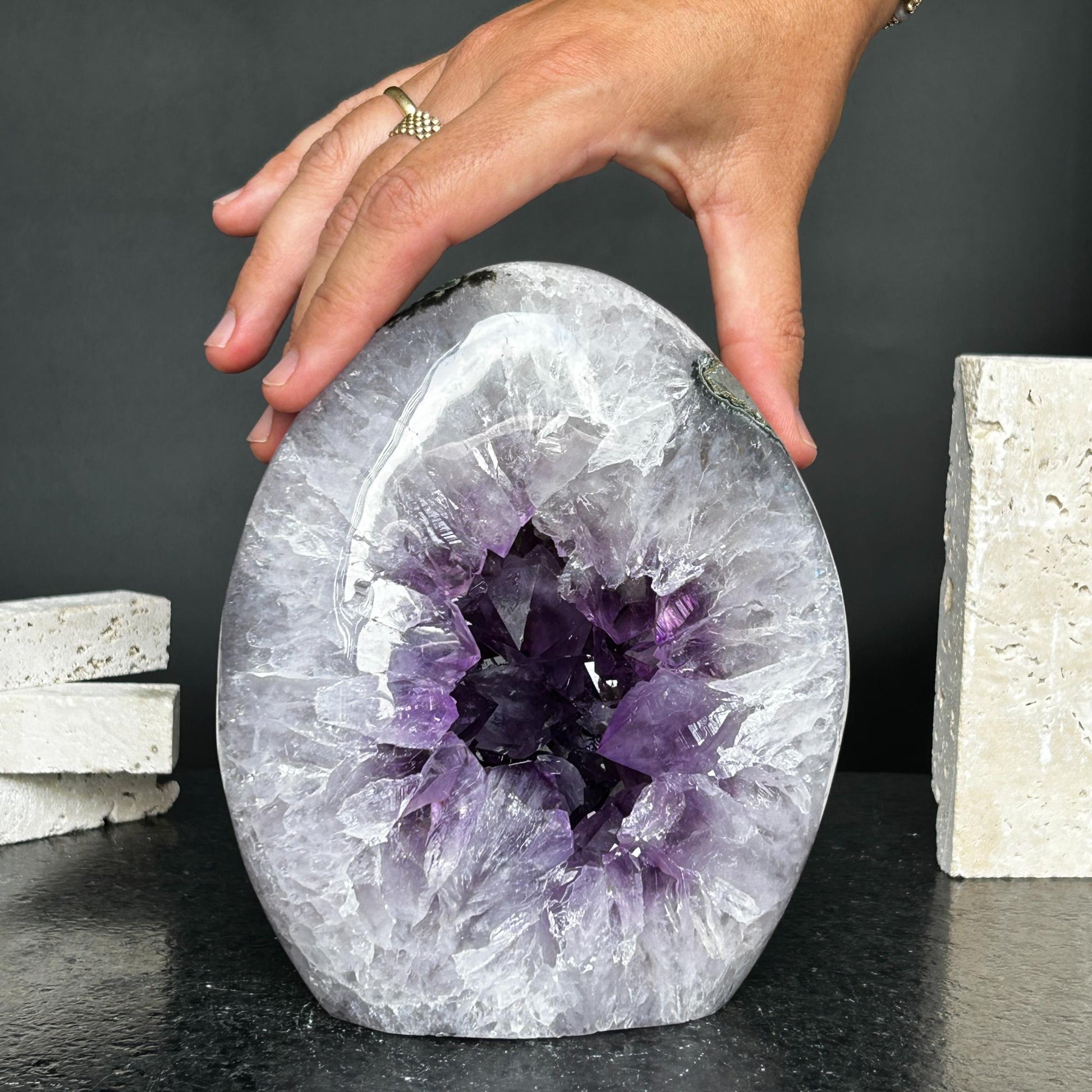 High Quality Amethyst Geode, Statement piece for collectors, Large Cave Egg shaped, polished stone, Stunning decor AAA Crystal