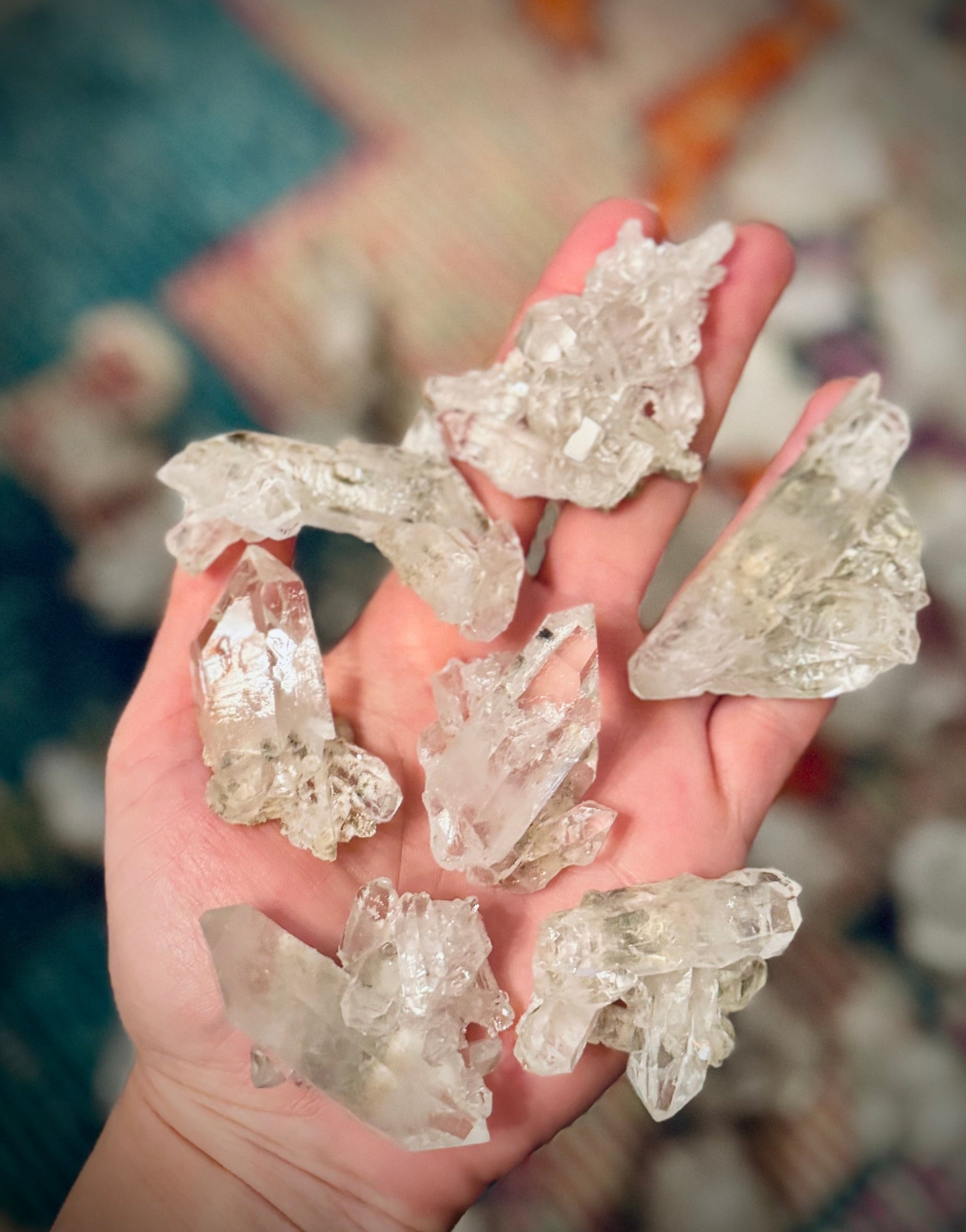 Radiant and full of crystalline brilliance, our high-quality Clear Quartz Clusters from Brazil are the very essence of clarity and amplification. Each cluster is a masterpiece of nature, with pristine, transparent points that capture and reflect light like frozen starlight. Some hold an even rarer treasure—delicate wisps of chlorite inclusions, grounding their luminous energy with the wisdom of the Earth.