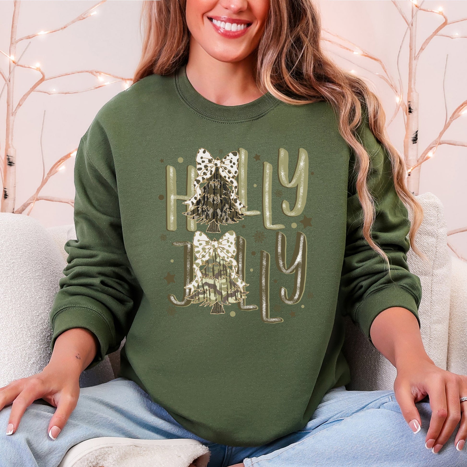 Holly Jolly, Camo Christmas Tree, Santa, Dalmatian Print, Ribbons, Bows Sweatshirt