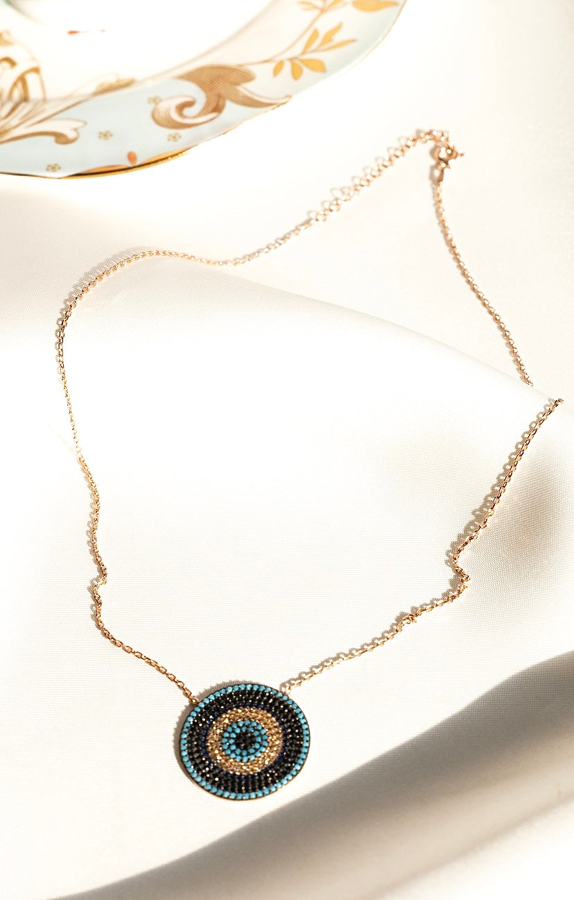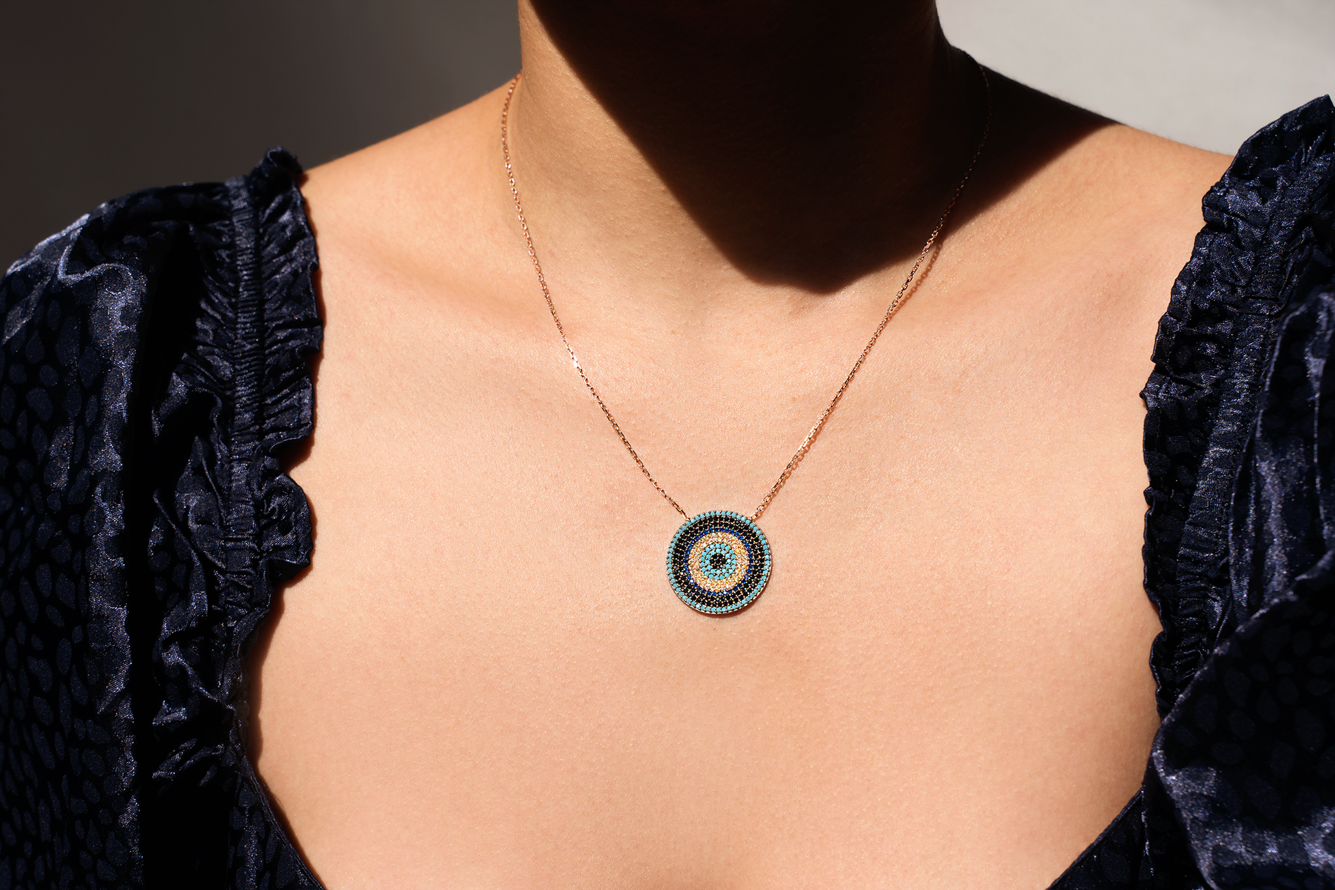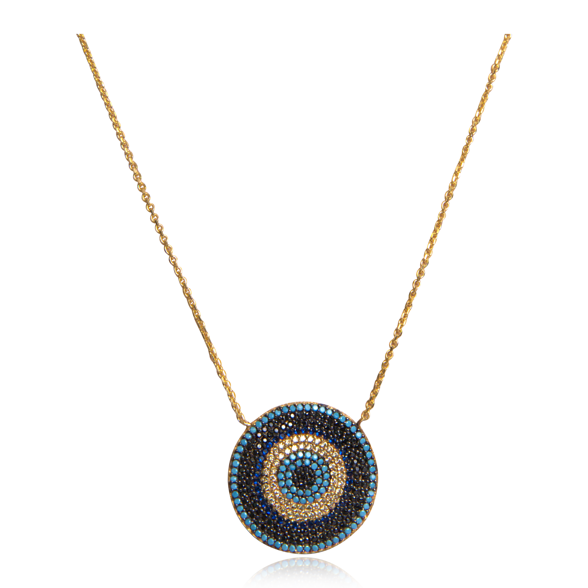 Sparkling round brilliant cut cubic zirconia in turquoise, canary yellow, and royal blue create a gorgeous combination of vibrancy on this contemporary evil eye necklace. Light baby blue nano turquoise adds serenity, all finely crafted from 925 sterling silver with a slinky chain.