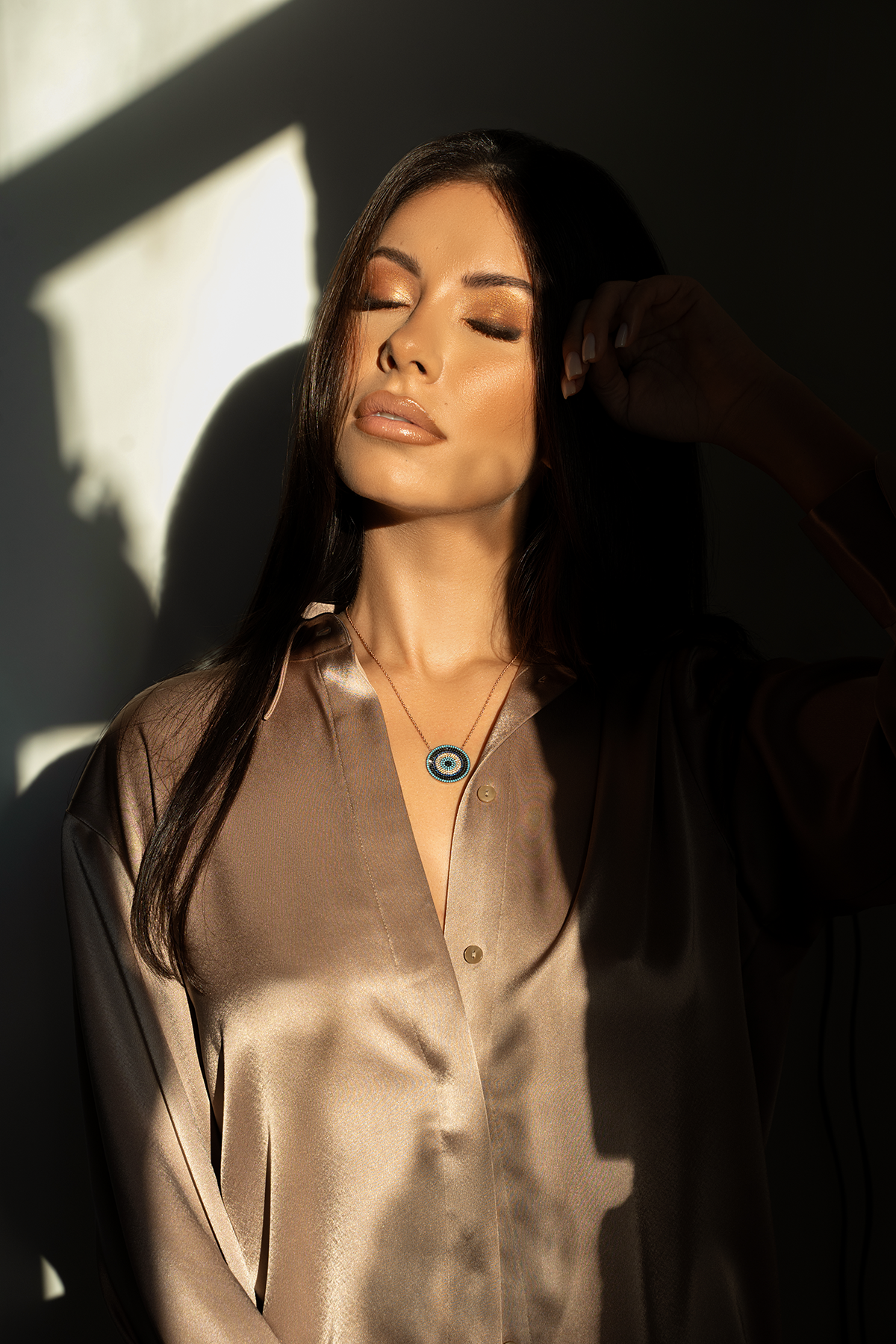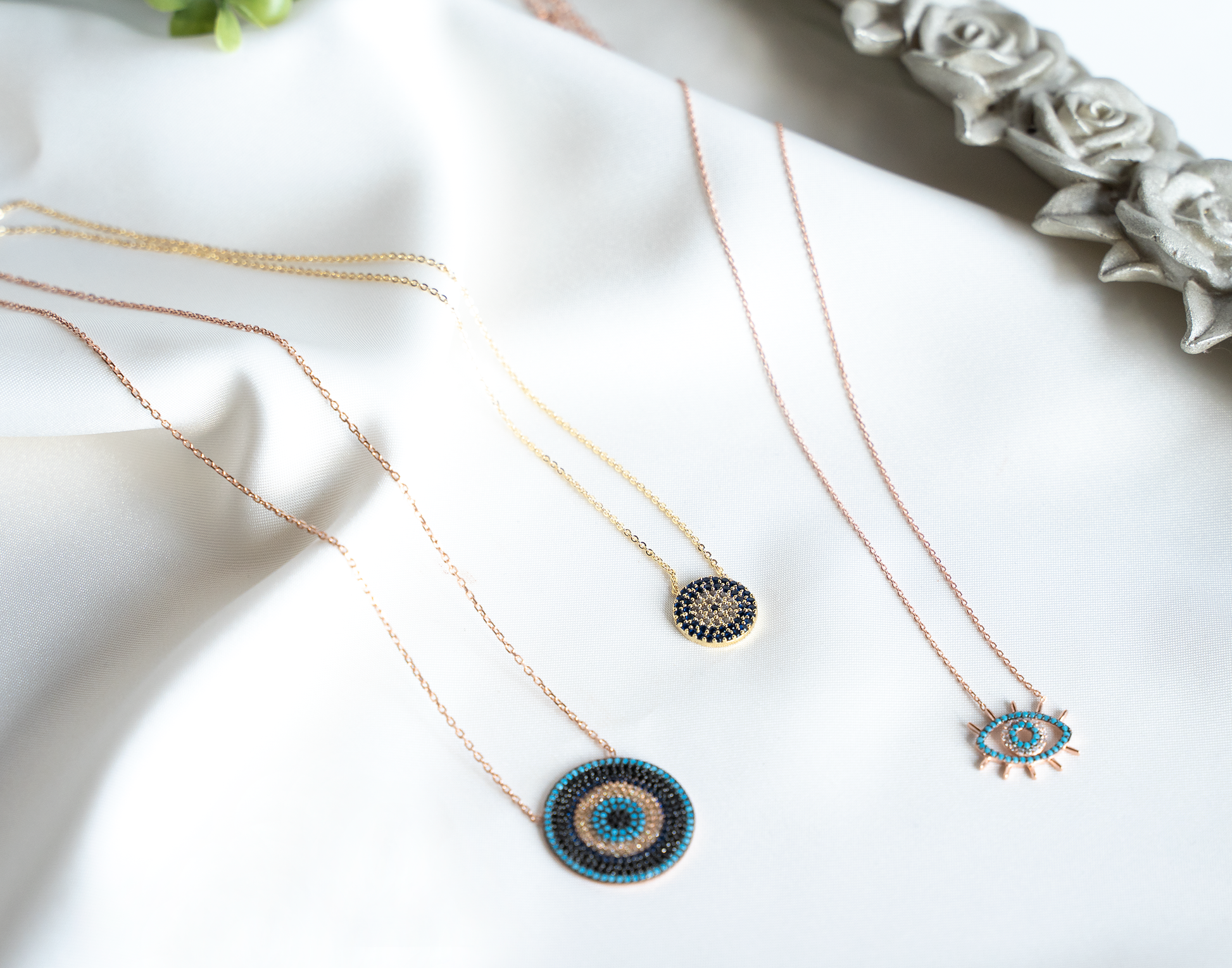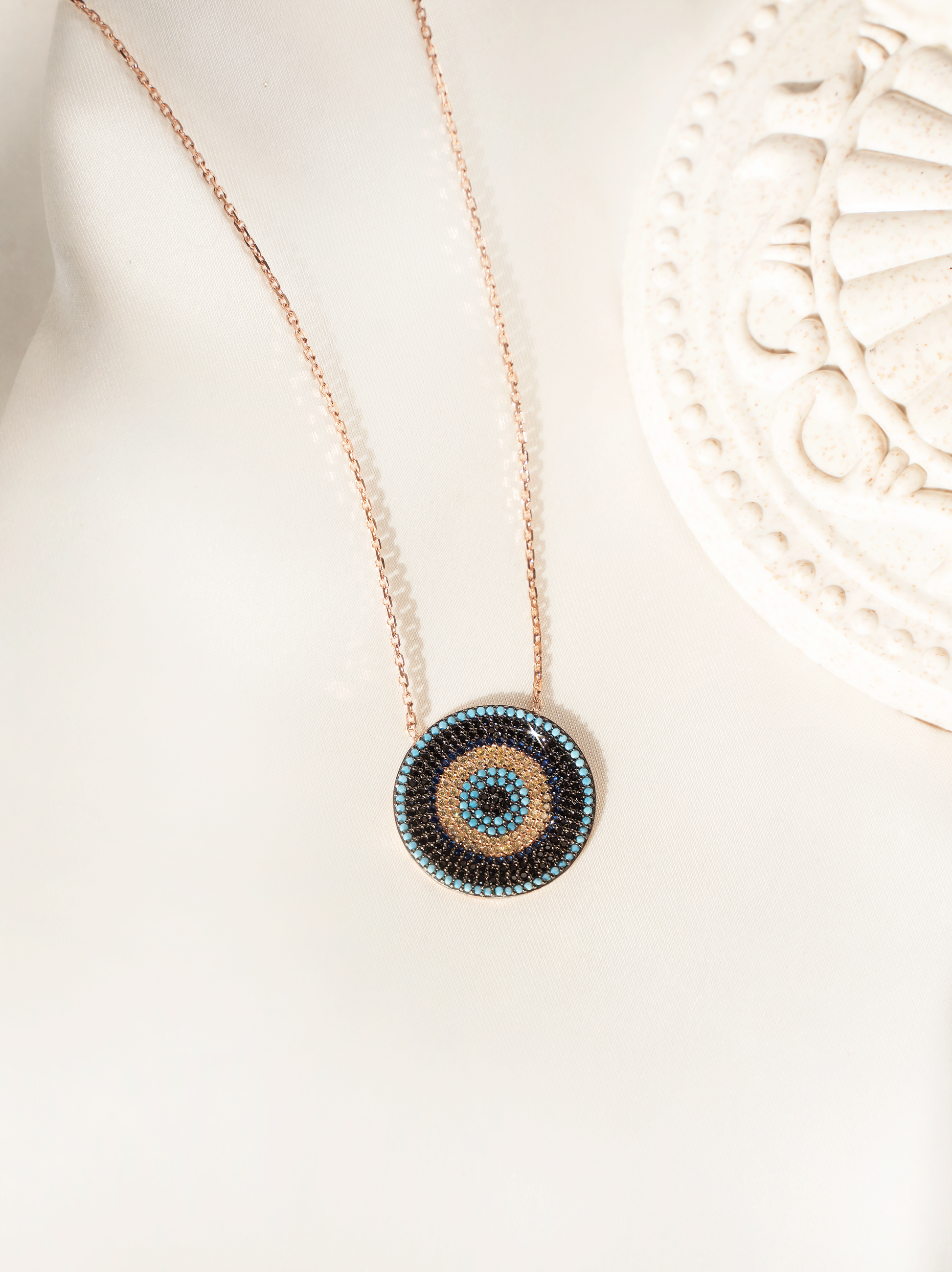 Sparkling round brilliant cut cubic zirconia in turquoise, canary yellow, and royal blue create a gorgeous combination of vibrancy on this contemporary evil eye necklace. Light baby blue nano turquoise adds serenity, all finely crafted from 925 sterling silver with a slinky chain.