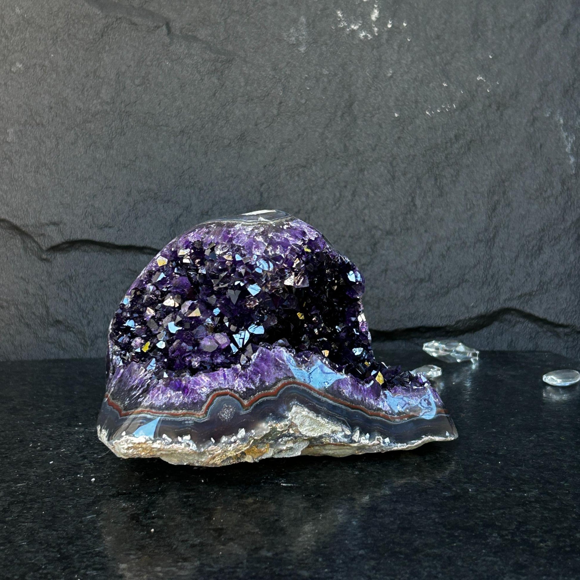 This amethyst geode cave with agate has the highest quality of the semi precious stones. It's a stunning crystal for centerpiece.