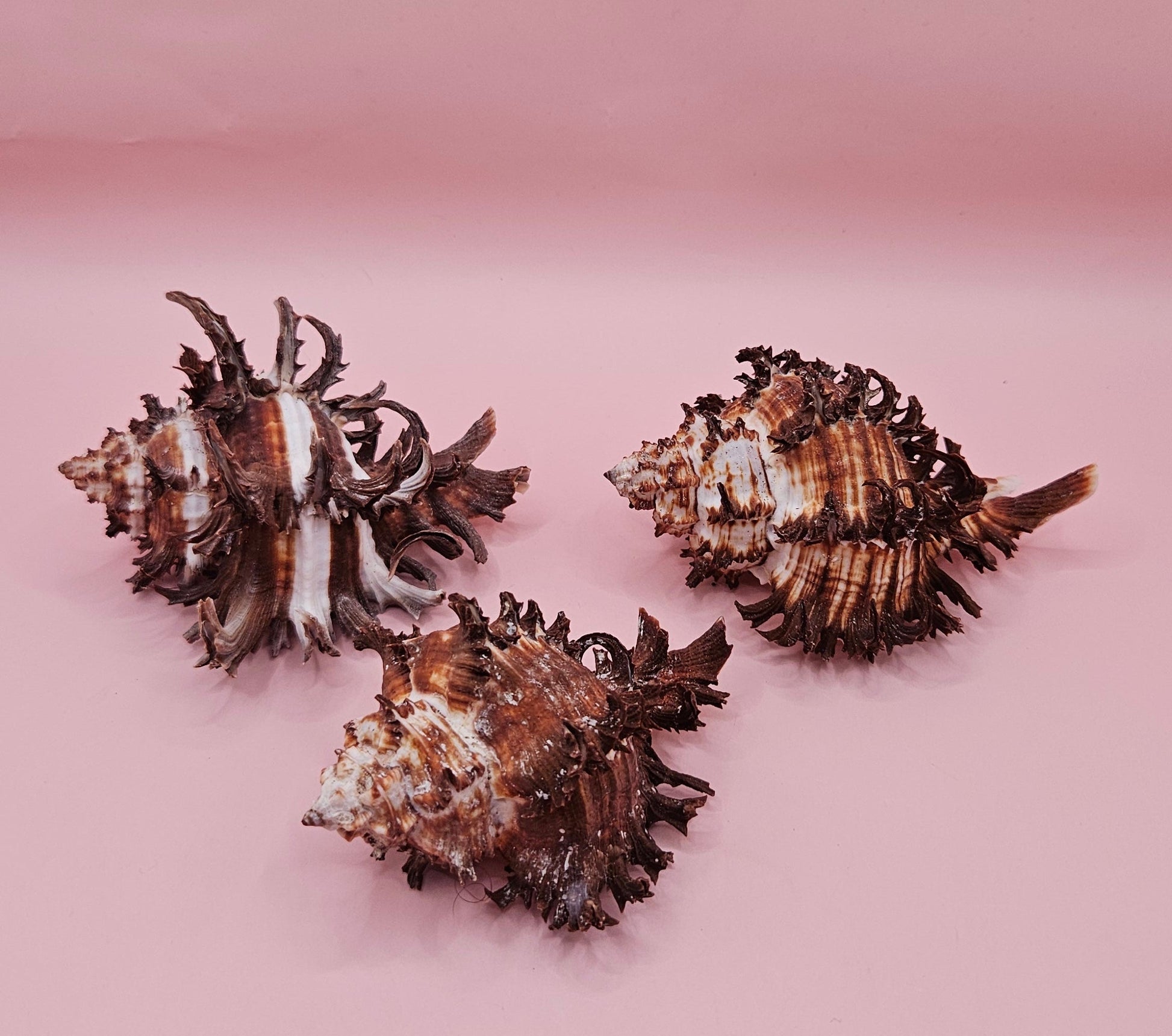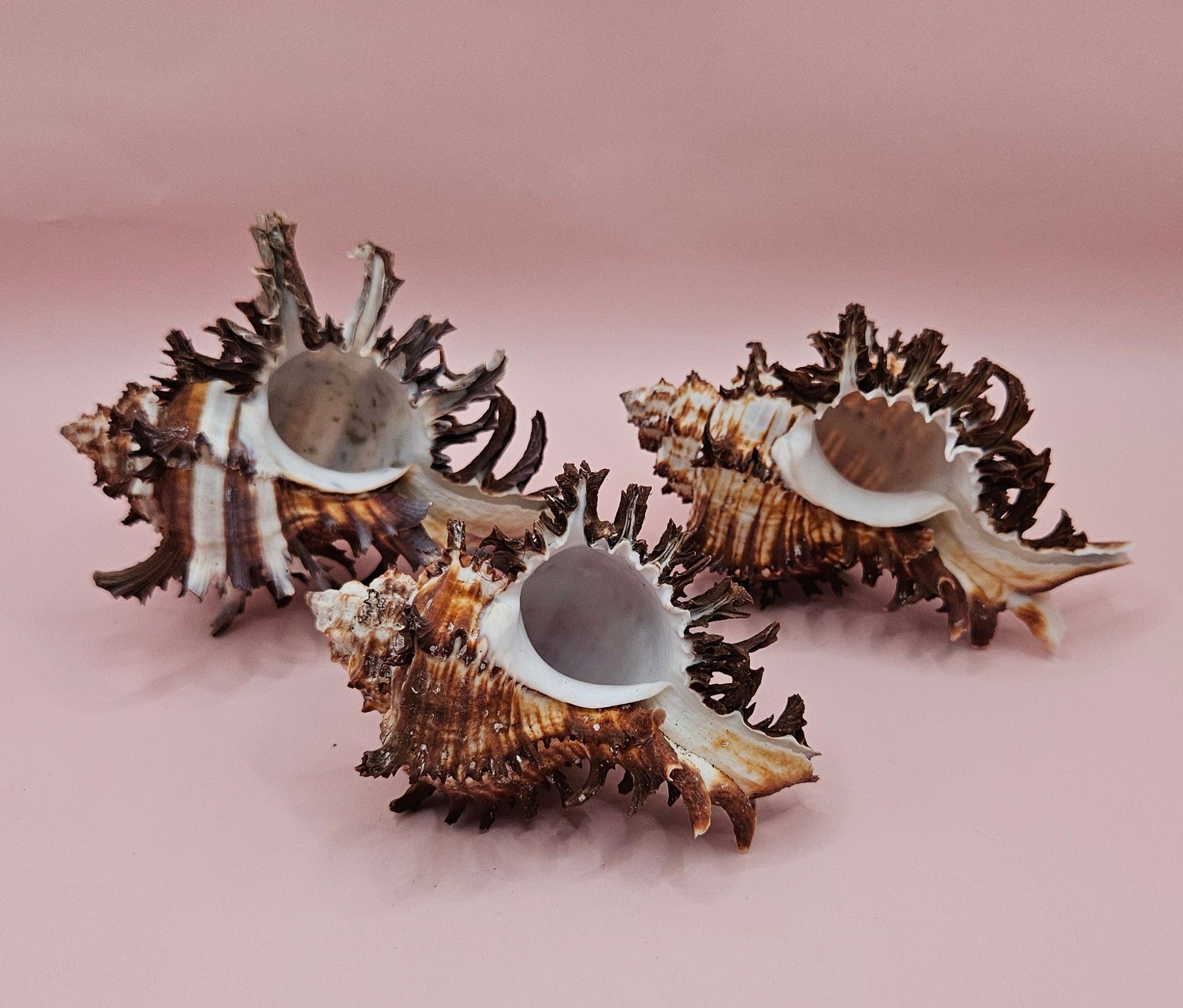 Add a striking touch of the sea to your decor with this bold and edgy trio of long spine Murex endive shells. Their dramatic spines and rich brown tones make them perfect for coastal-inspired displays or naturalistic home accents.