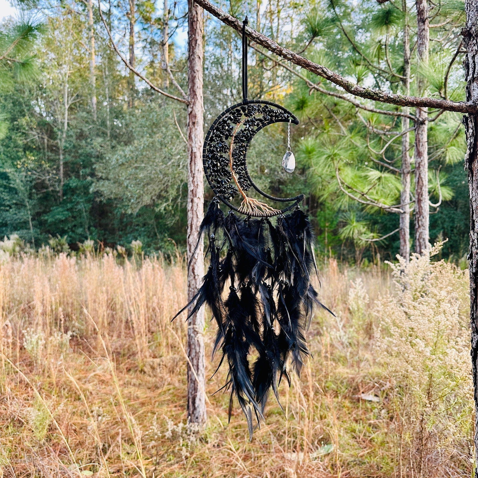 Medium Wall Hanging Crescent Moon Dream Catcher with Black Obsidian Stones & Hanging Stone Charm with Feathers Blacked Out Modern Home Decor