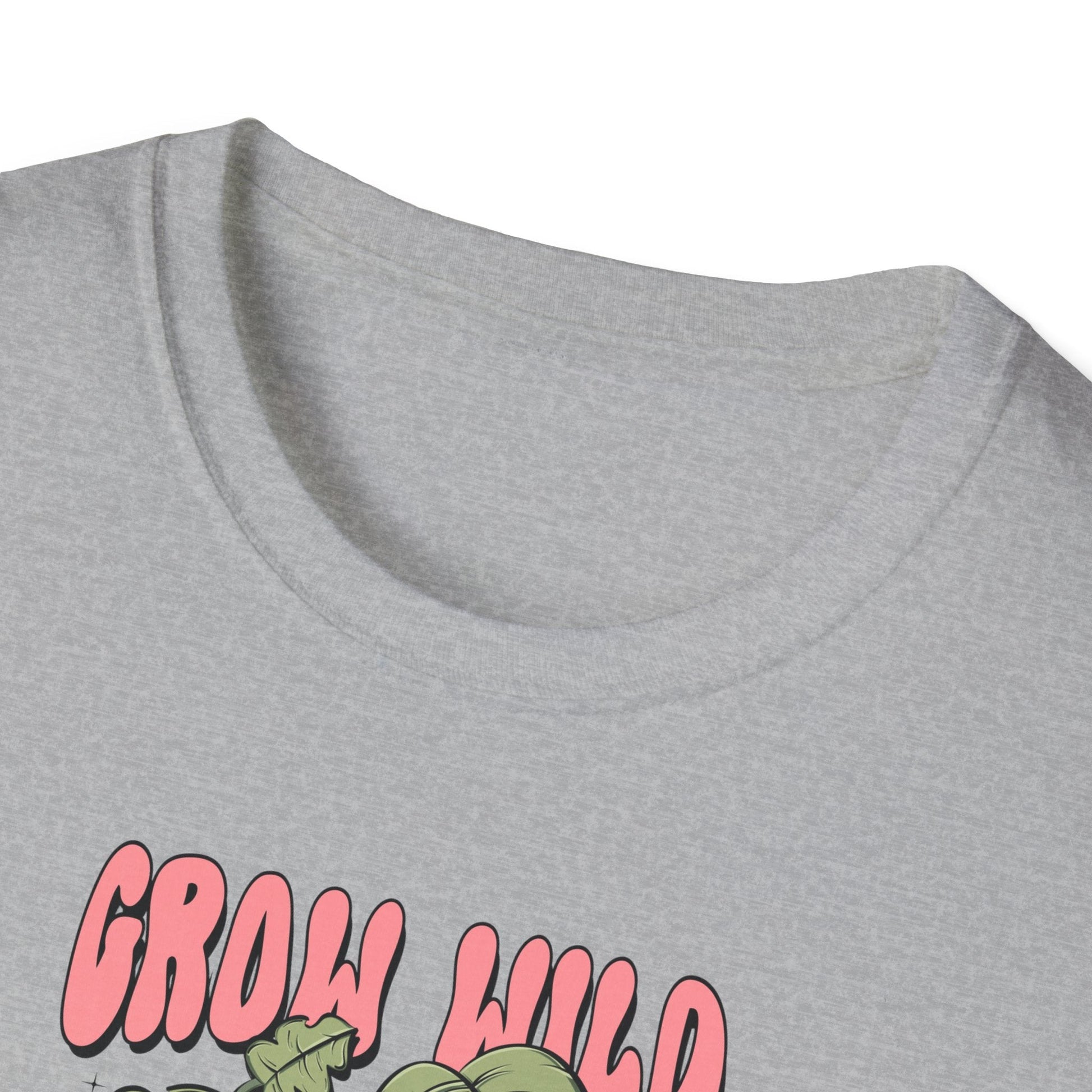 A unisex softstyle T-shirt featuring the design 'Grow Wild Be Happy' with a monstera potted plant, perfect for plant lovers and those seeking positive mental health. This lightweight and durable shirt is made from 100% ring-spun cotton, with a classic fit and crew neckline for versatile styling. Ideal for adults and suitable for any occasion, this tee is ethically produced and certified for safety and quality assurance.