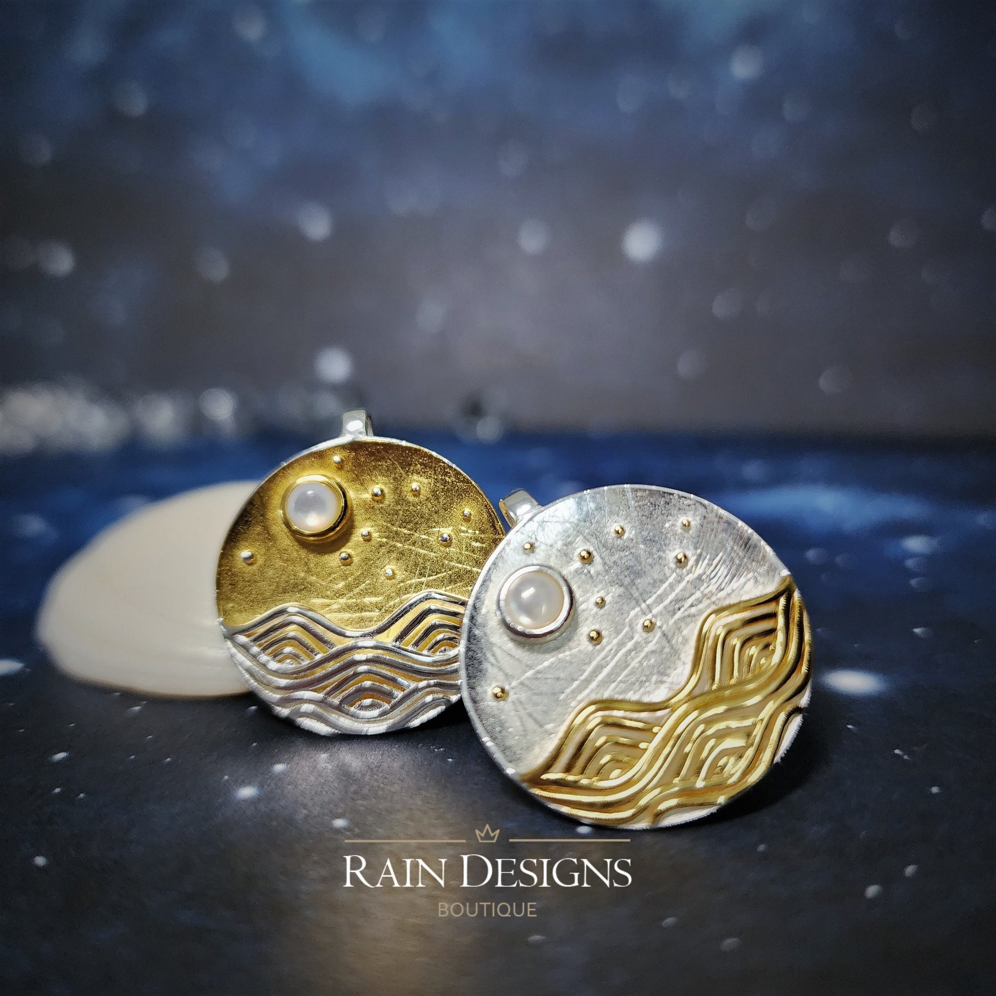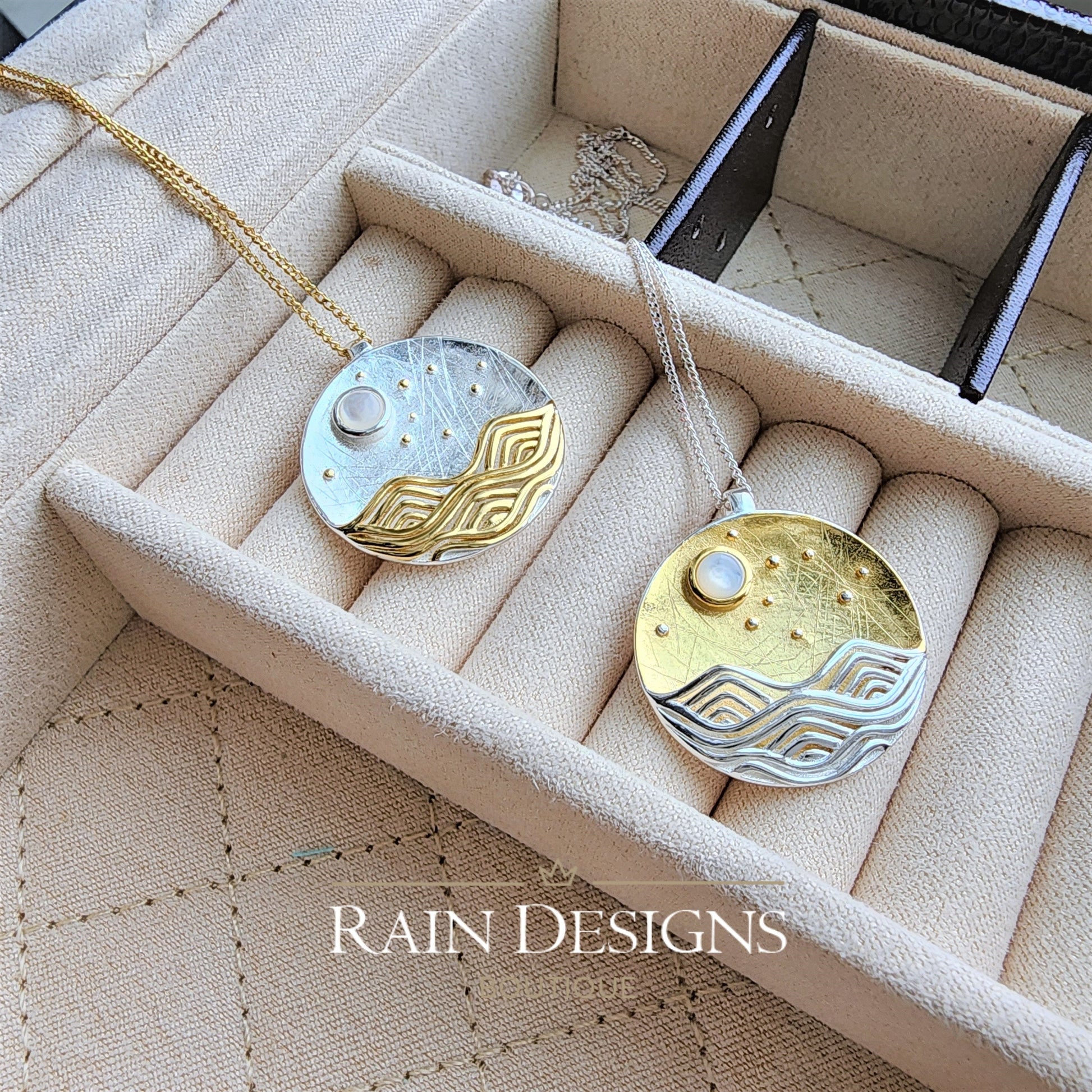The beauty of the moonlight reflecting on the mountains during a night in the wilderness inspired our necklace design. Moonlight silver necklace is made with 18K gold plated solid 925 sterling silver. We have both 18K gold plated S925 silver chain and solid S925 silver chain. Please let seller know which chain you prefer to pair with the pendant. We also have matching earrings.