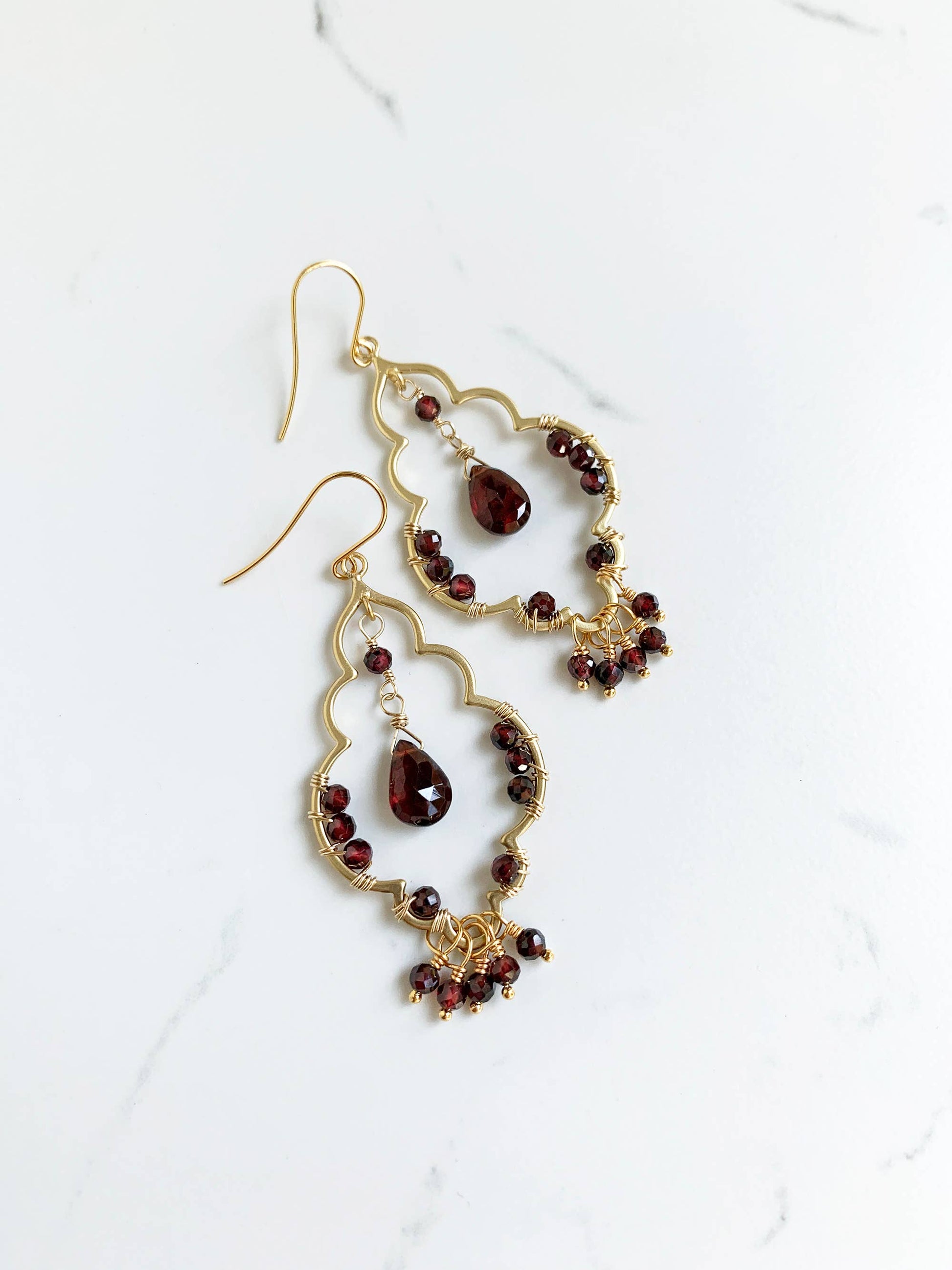 Chandelier earrings that highlight the lovely garnet gemstone. These earrings are inspired by Moroccan patterns and motifs that are captivating. Amazing for holidays and special occassions.