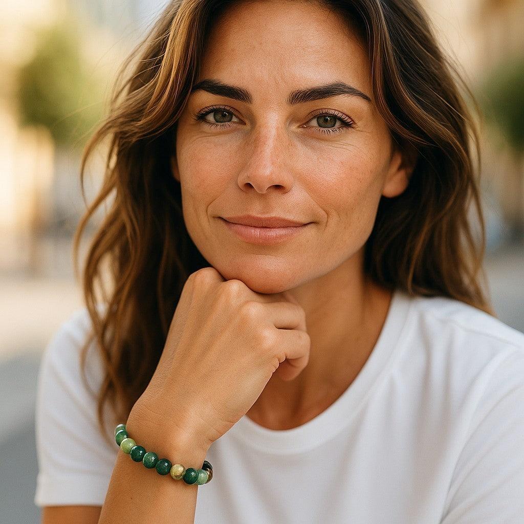 This funky Moss Agate Stretch Bracelet will add a touch of nature to your style. With its unique stone pattern, it's a fun and playful accessory that will make a statement. Stretchy and easy to wear, this bracelet will add a trendy touch to any outfit.