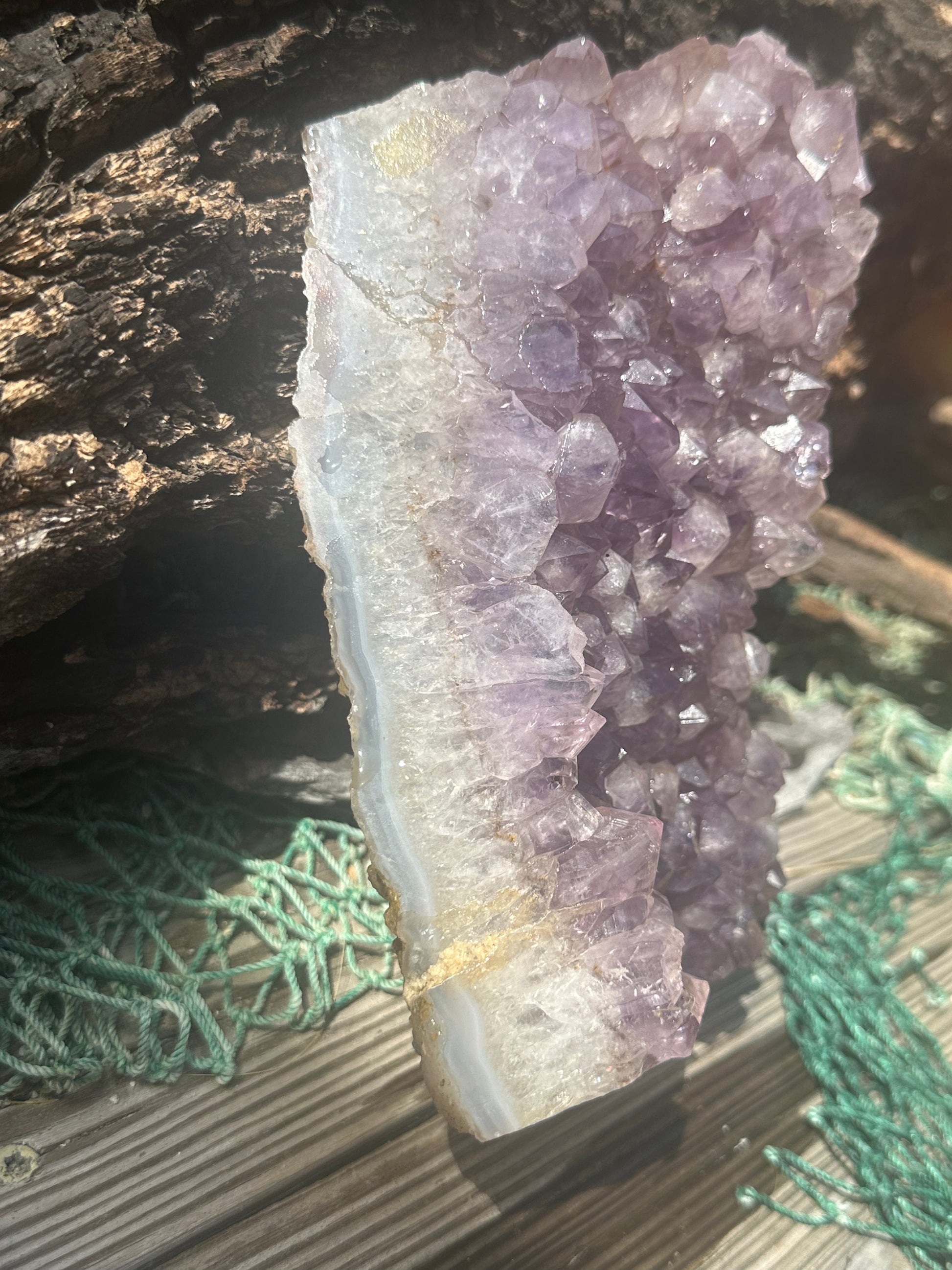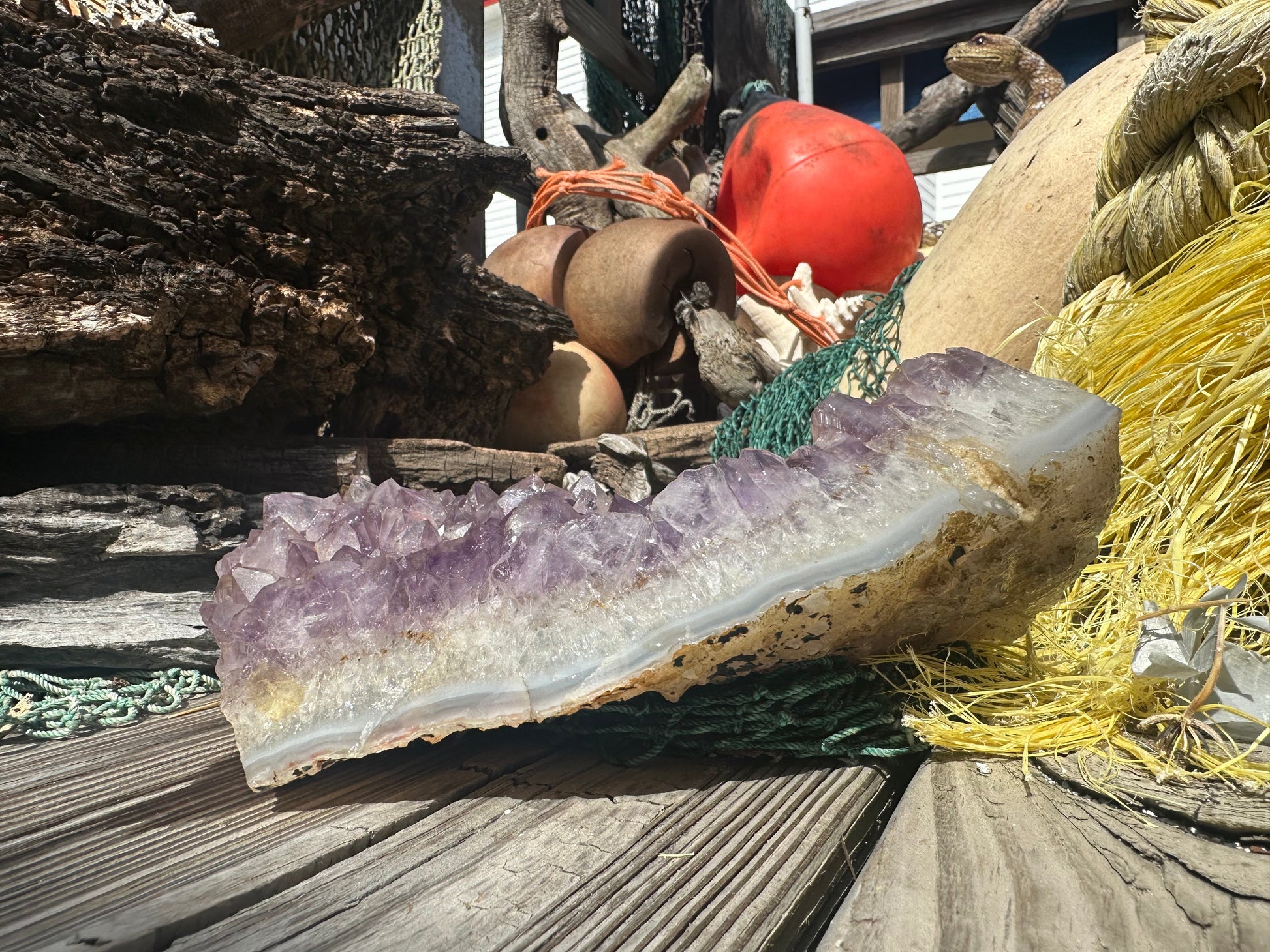 Bring natural elegance and calming energy into your home with this stunning Amethyst Cluster. Showcasing vivid violet crystal points rising from a rugged quartz base, this raw specimen adds beauty and balance to any space—whether styled on a shelf, incorporated into a meditation altar, or added to a growing mineral collection. Its sparkling crystal texture and bold color palette make it a captivating natural centerpiece.