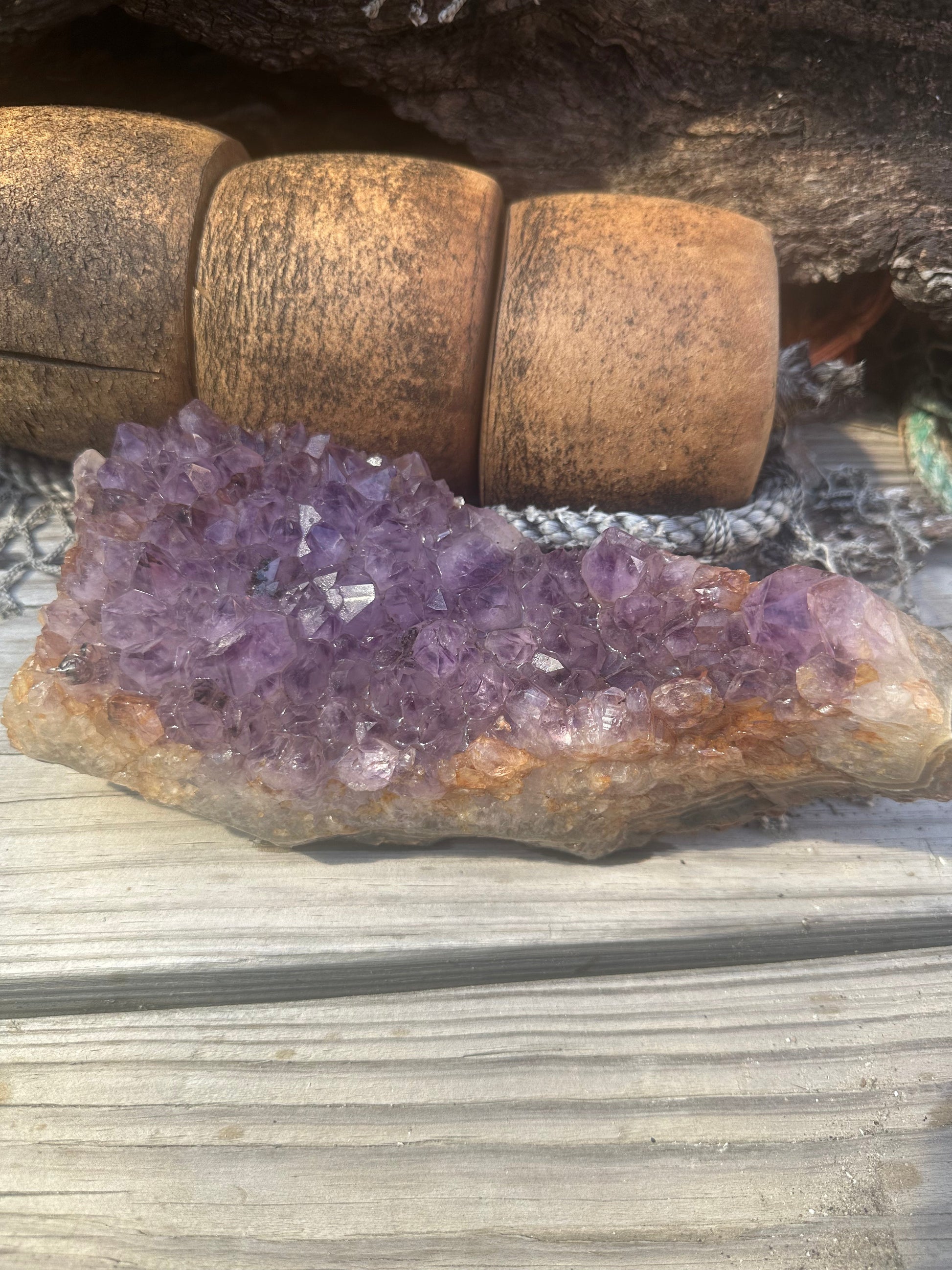 Add a touch of natural elegance and calming energy to your space with this striking Amethyst Cluster. Featuring vivid violet crystal points on a rugged quartz matrix, this raw specimen serves as a stunning accent for home décor, meditation spaces, or curated mineral collections. Its sparkling crystalline texture and rich coloration make it a true statement piece.