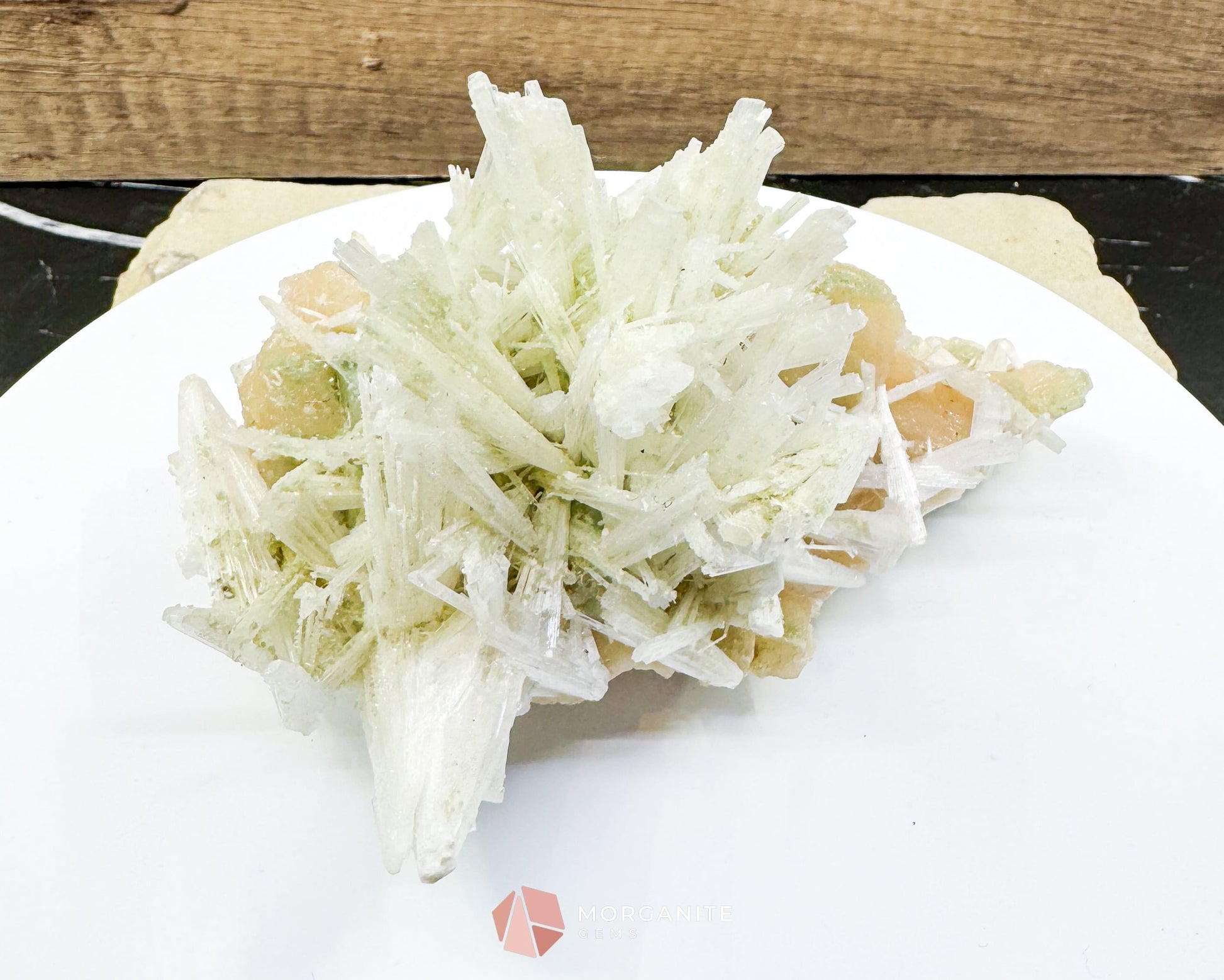 This stunning zeolite crystal cluster combines a radiant scolecite spray with glowing orange stilbite blades, forming a powerful and visually striking specimen. Ideal for healing, meditation, reiki work, or spiritual décor, this natural beauty brings both energy and elegance to any collection or sacred space.