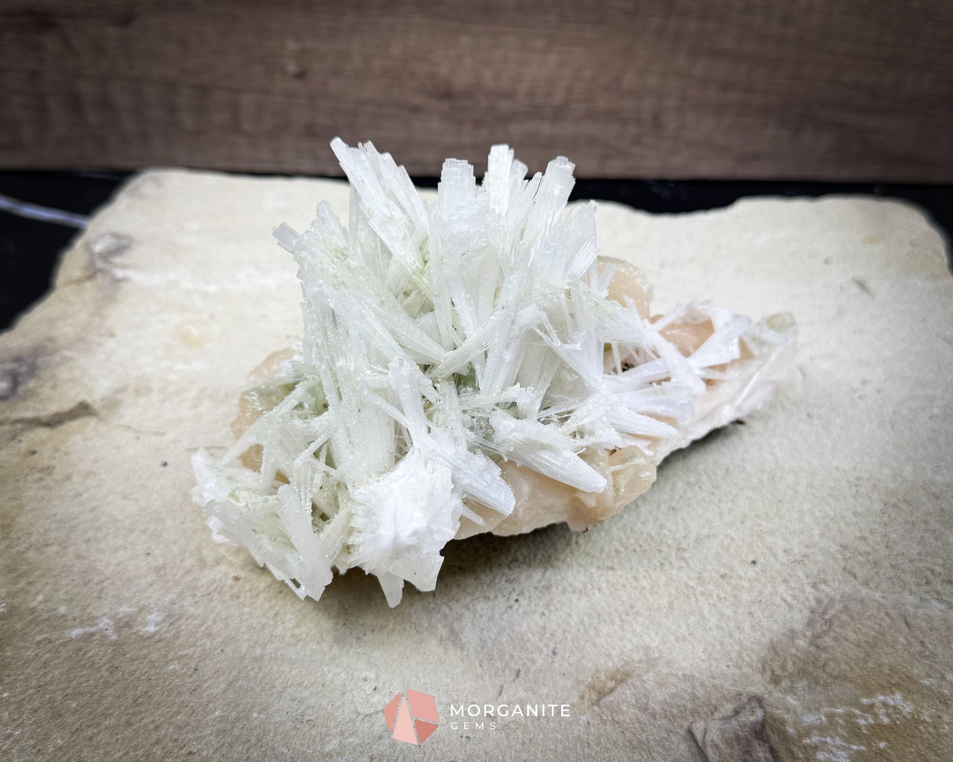 - 💎 Mineral Composition: White, needle-like scolecite crystals erupting from a peach-orange stilbite base