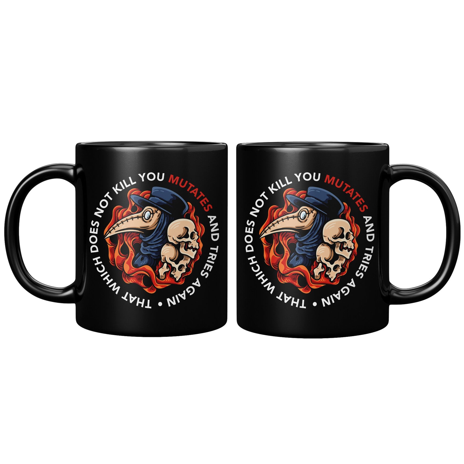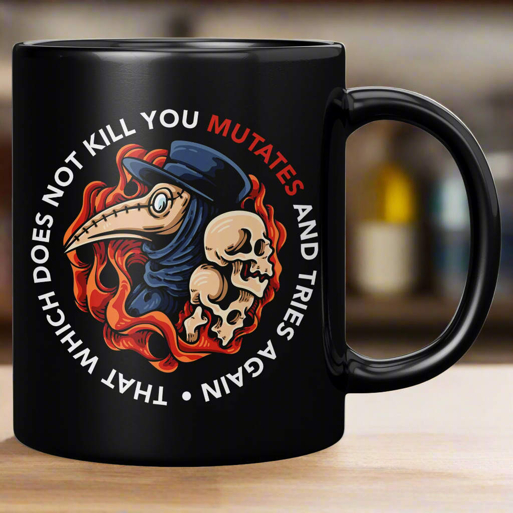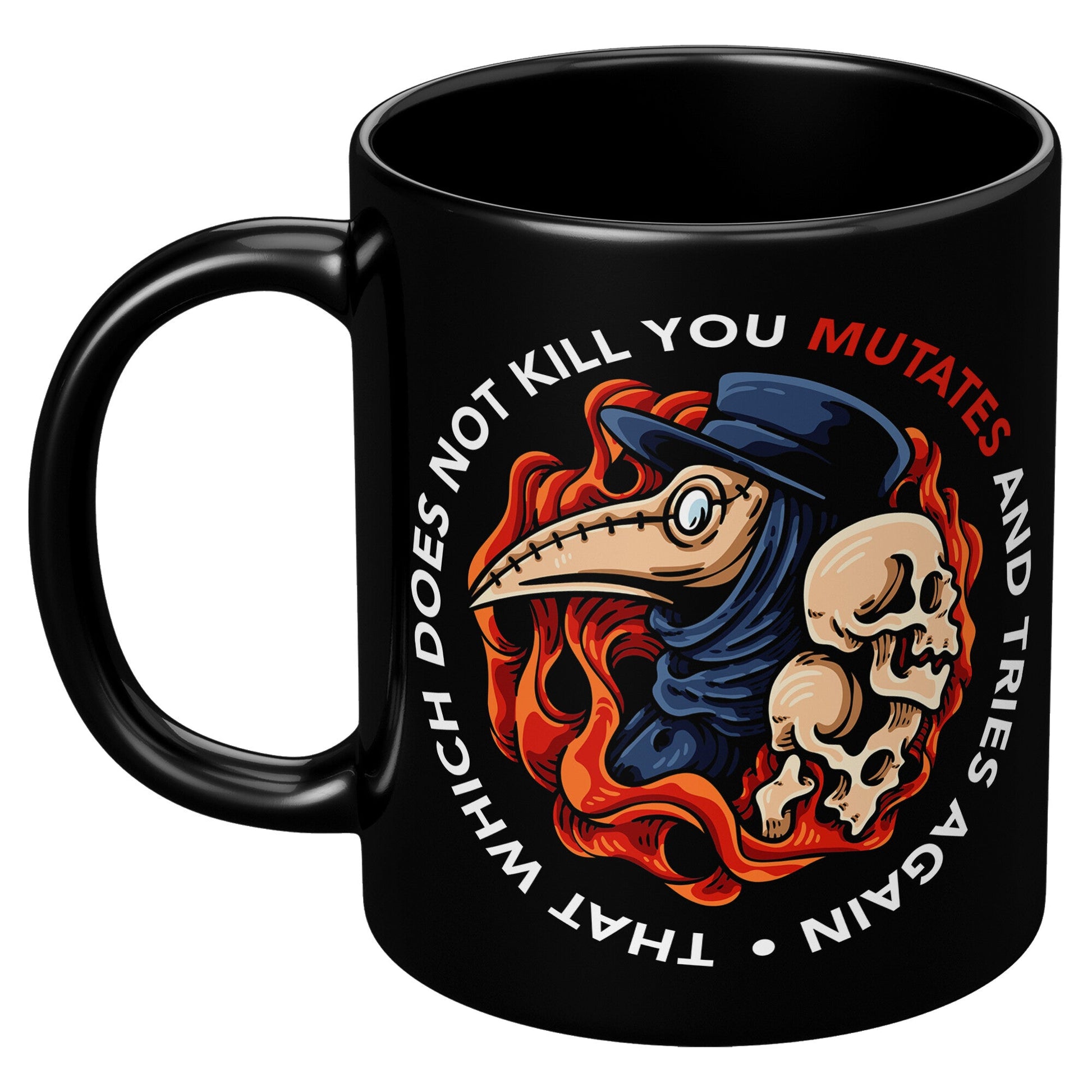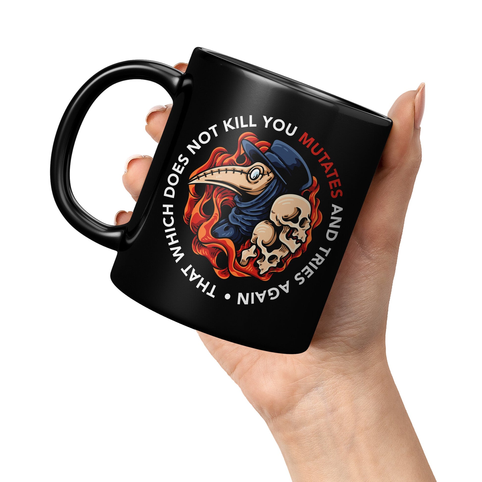 Embrace the resilience of the human spirit with the Plague Doctor 11 oz Ceramic Mug. This glossy black mug features striking artwork of a plague doctor engulfed in flames, accompanied by the text "That which does not kill you mutates and tries again." It serves as a powerful reminder of determination and adaptability.