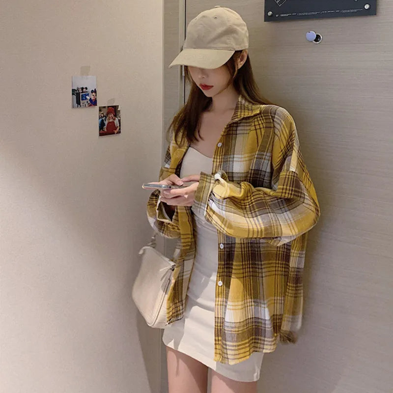 Plaid Shirt Women Spring Long Sleeve Top Female Vintage OL Fashion Single Breasted Blouse Ladies Preppy Style Loose Check Shirts