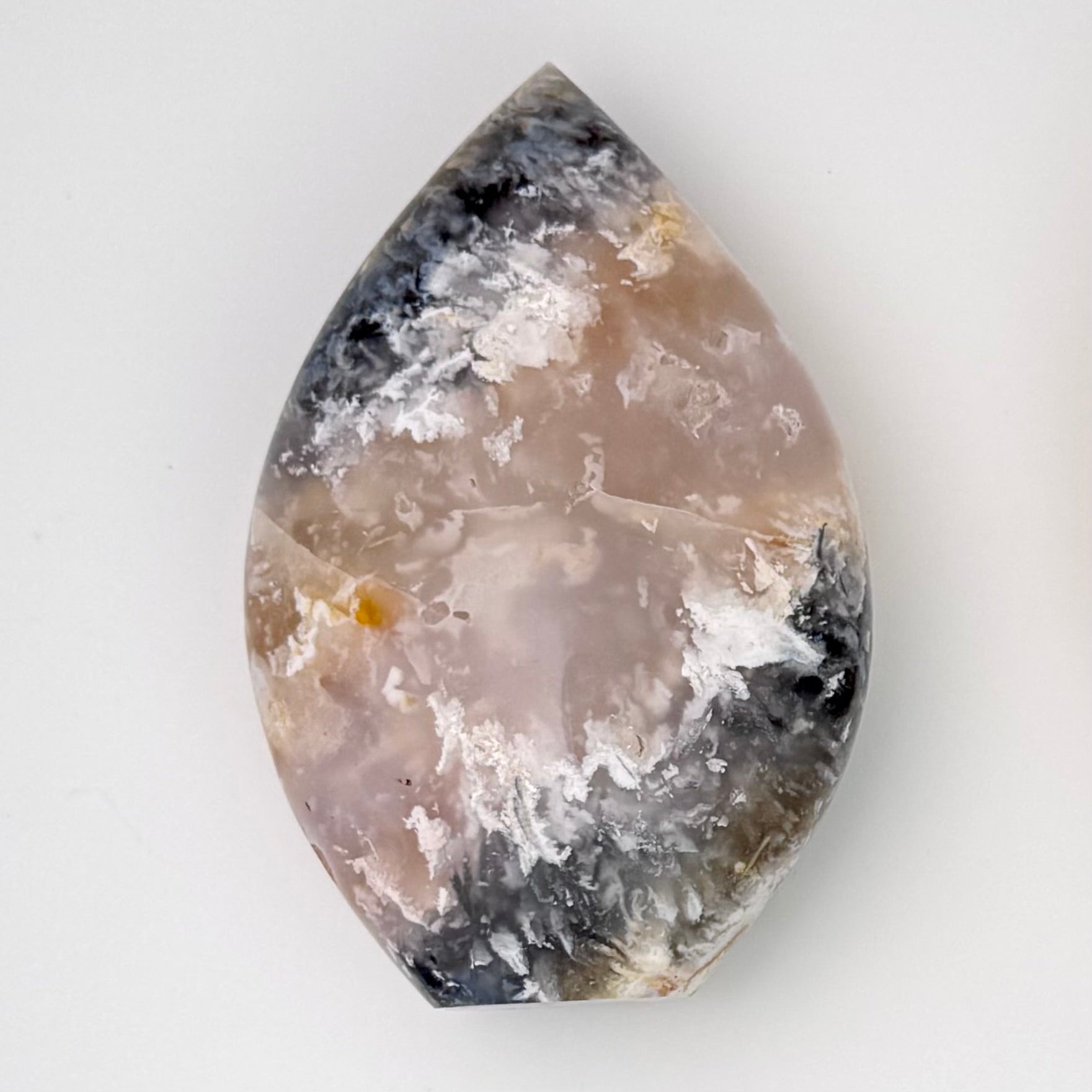 Plume agate aides in promoting balance, energy, and harmony. It's also thought to enhance analytical thinking, decision-making, and memory, while also supporting mental health by reducing anxiety and promoting peace and emotional healing.