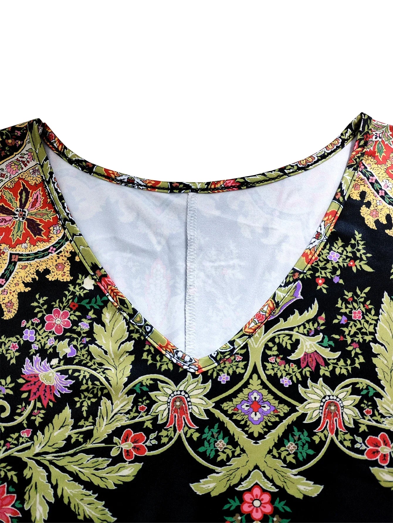 Plus Size Women's Boho Floral Maxi Dress, Long - Sleeve V - Neck, Ethnic Print