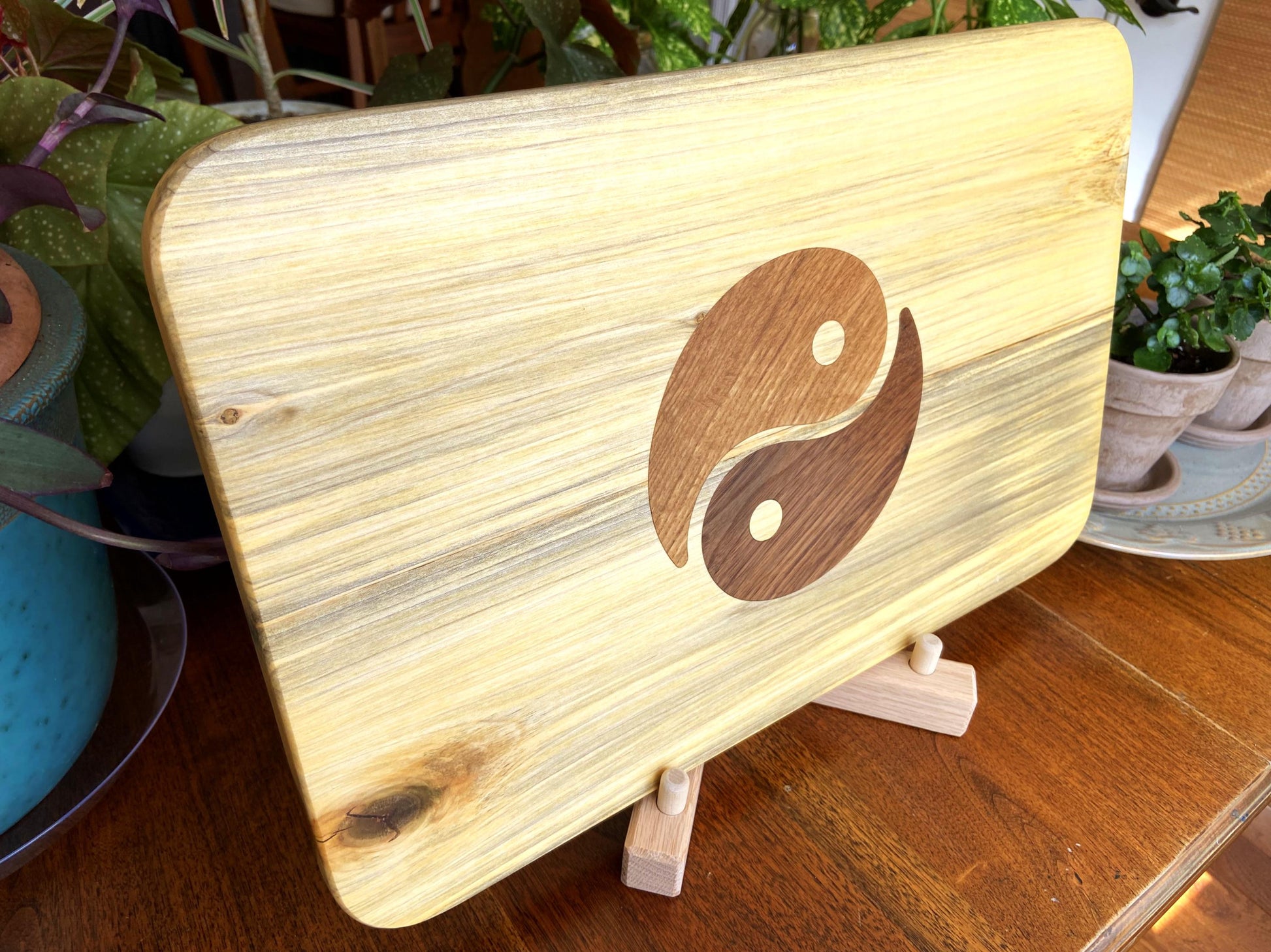 Poplar charcuterie board with Yin Yang inlay made from White Oak and Peruvian Walnut.