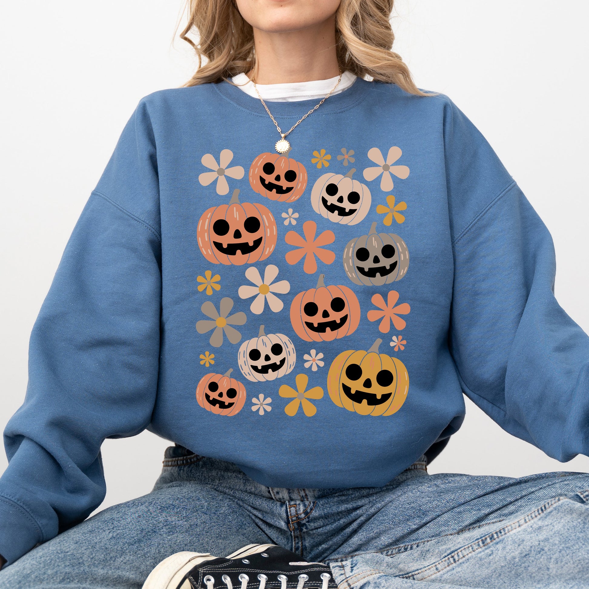 Celebrate the spooky season with the Pumpkins and Flowers Halloween Graphic Sweatshirt. This bold piece fuses eerie charm with neon-infused retro-vintage style, drawing on classic horror aesthetics to make your autumn outfits stand out at any gathering.