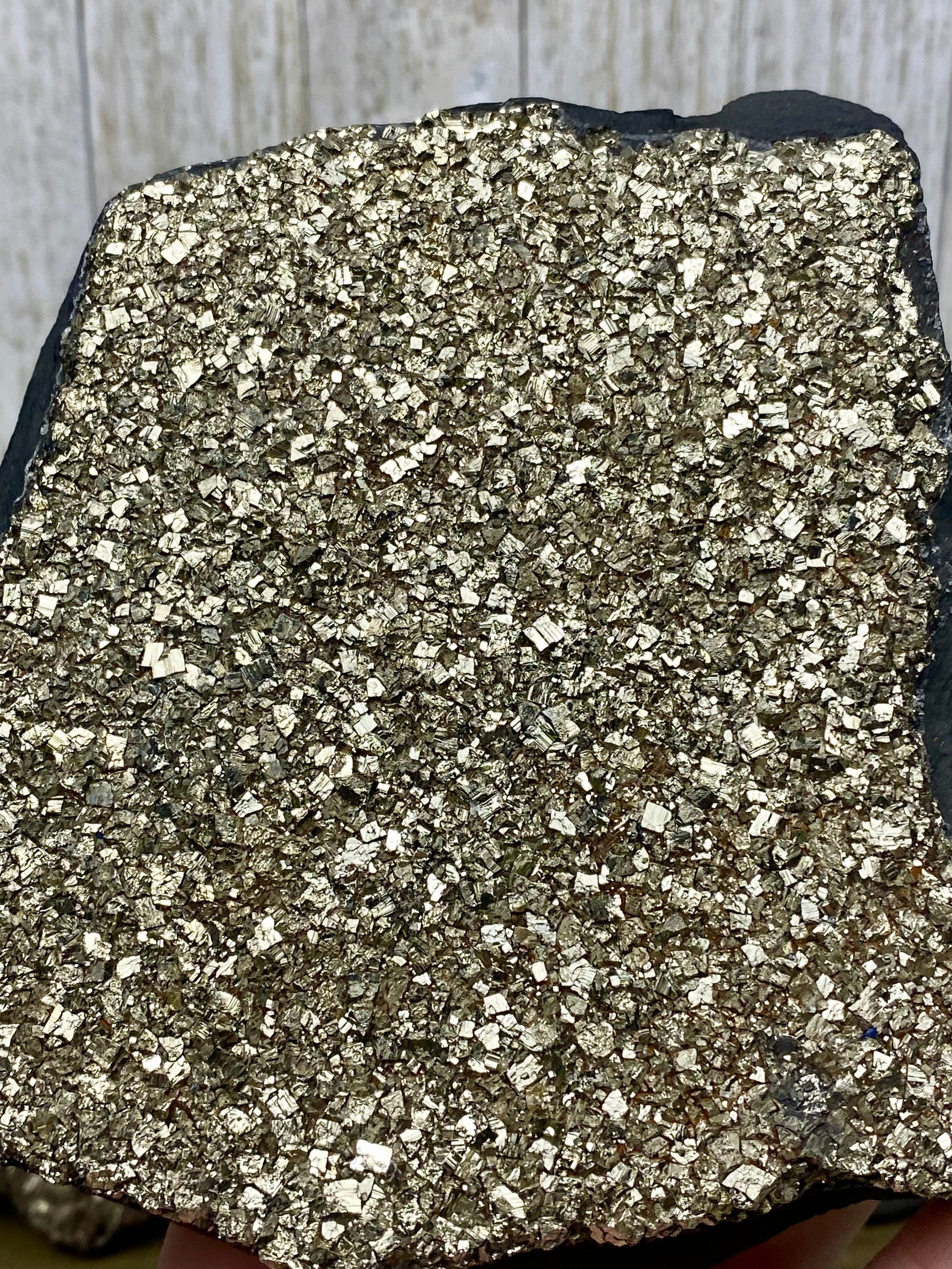 This new find from Brazil has stunningly lustrous cubic pyrite layered on carbon-heavy Shungite. This combination has great contrast between the shining gold and matte black of the two minerals.