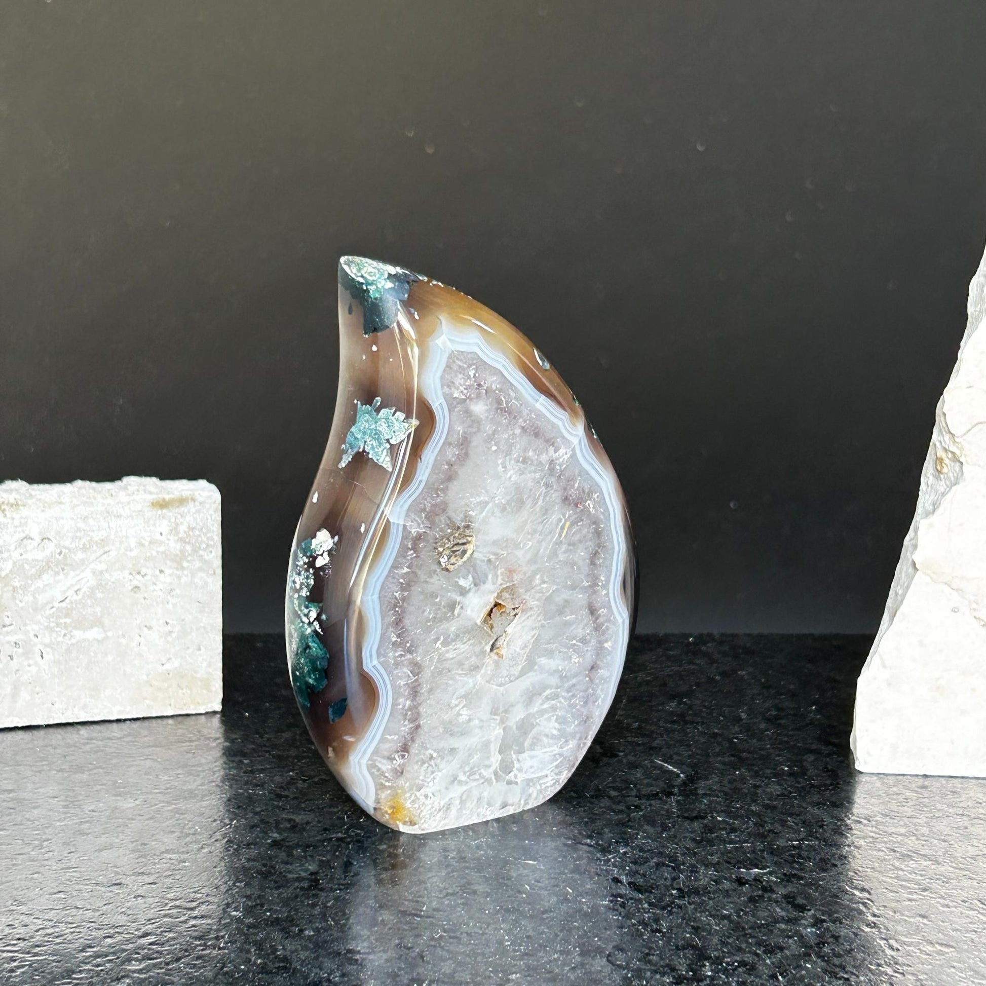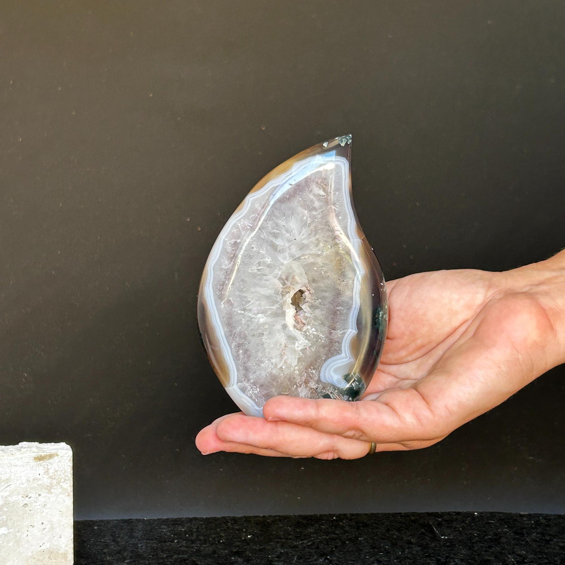 This flame was carefully polished edges to show the wonderful formations of agate, in shades of white.