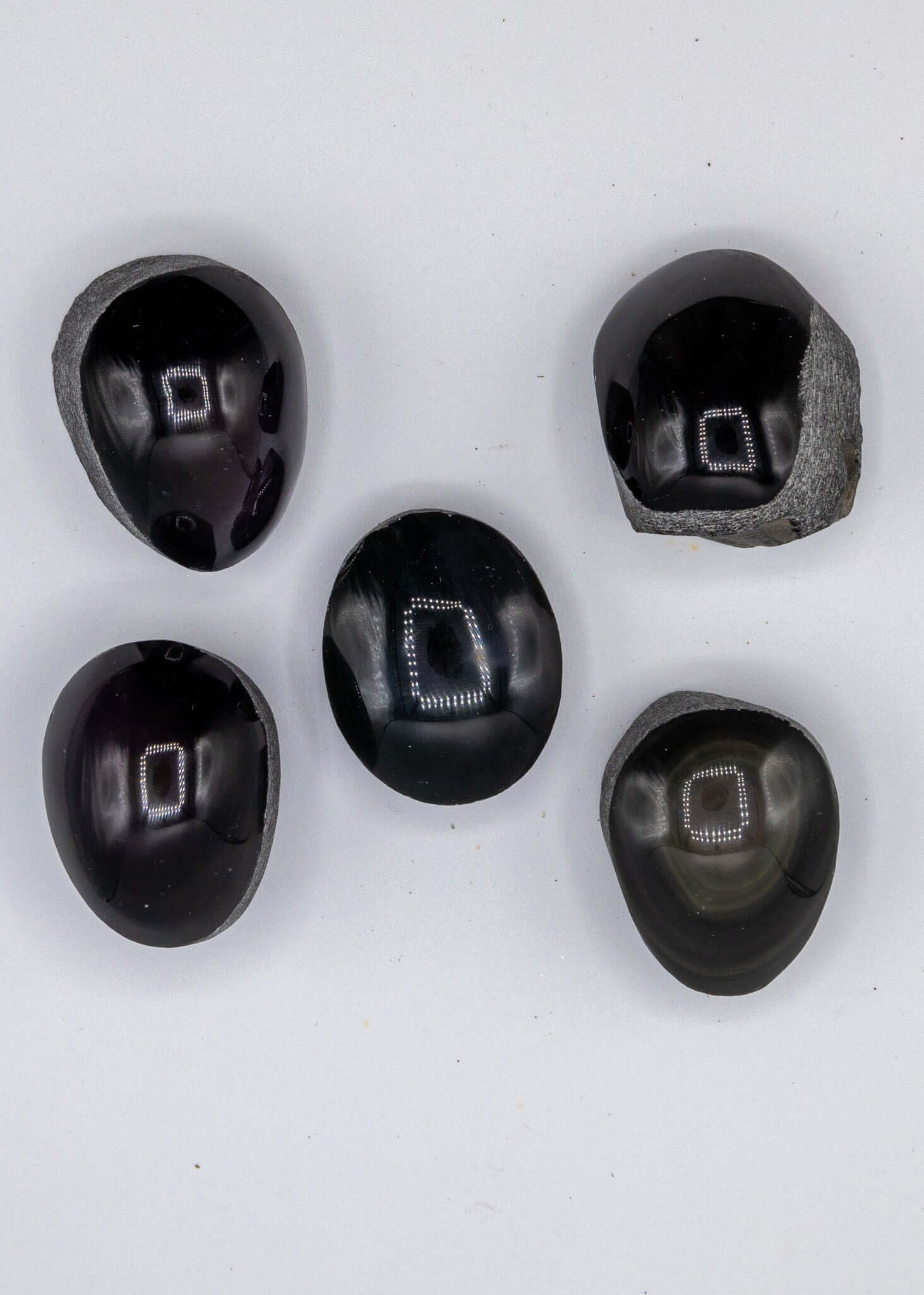 Each piece is a naturally formed section of obsidian with unique rainbow flashes and polished facets.